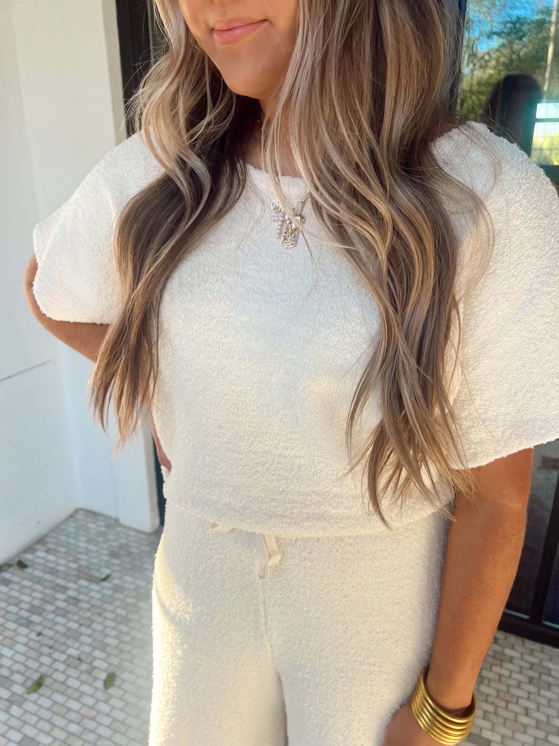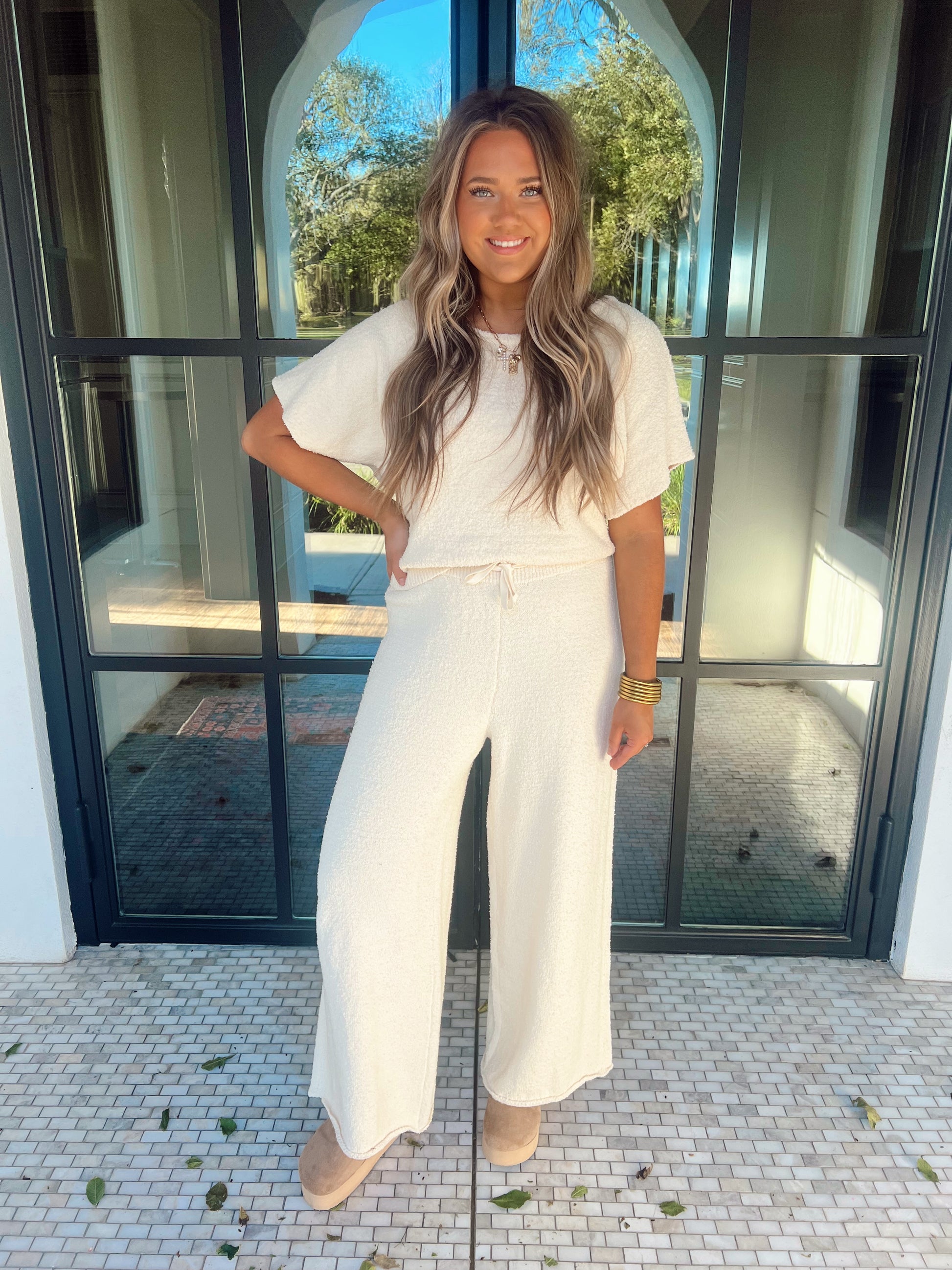 The Above the Clouds Top brings playful charm to your wardrobe with its textured knit fabric and cute short sleeves. The back tie adds a flirty twist, making it perfect for breezy days and casual hangouts. Comfortable and stylish, it’s designed to lift your mood and your look effortlessly.