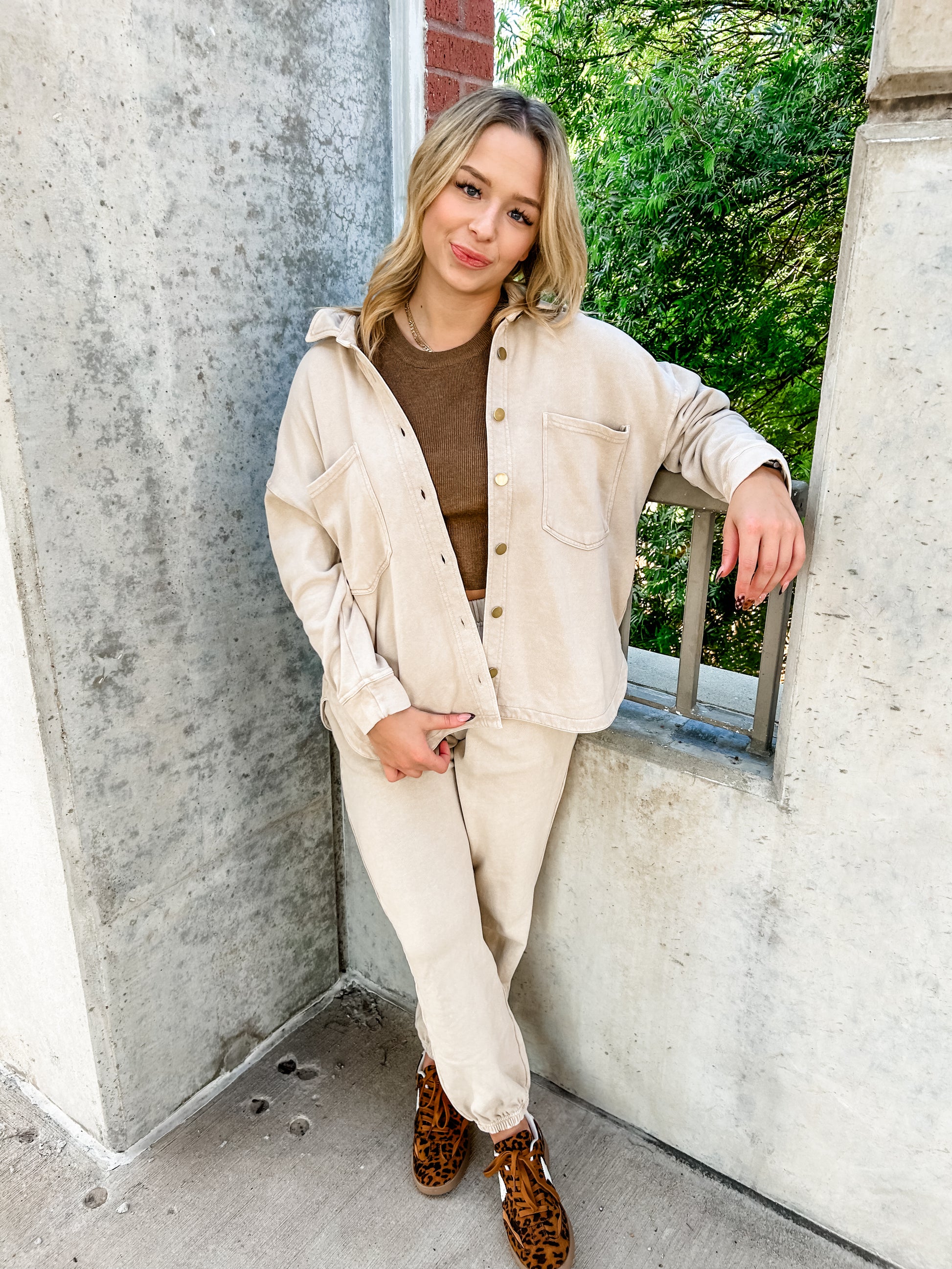 Get cozy and look stylish with the All For It Beige Shacket. Made from washed sweatshirt fabric with a dye and washed finish, it's super soft and comfortable. Combine it with the matching sweatpants for a complete, chic look. Feel warm and fashionable in this shacket!
