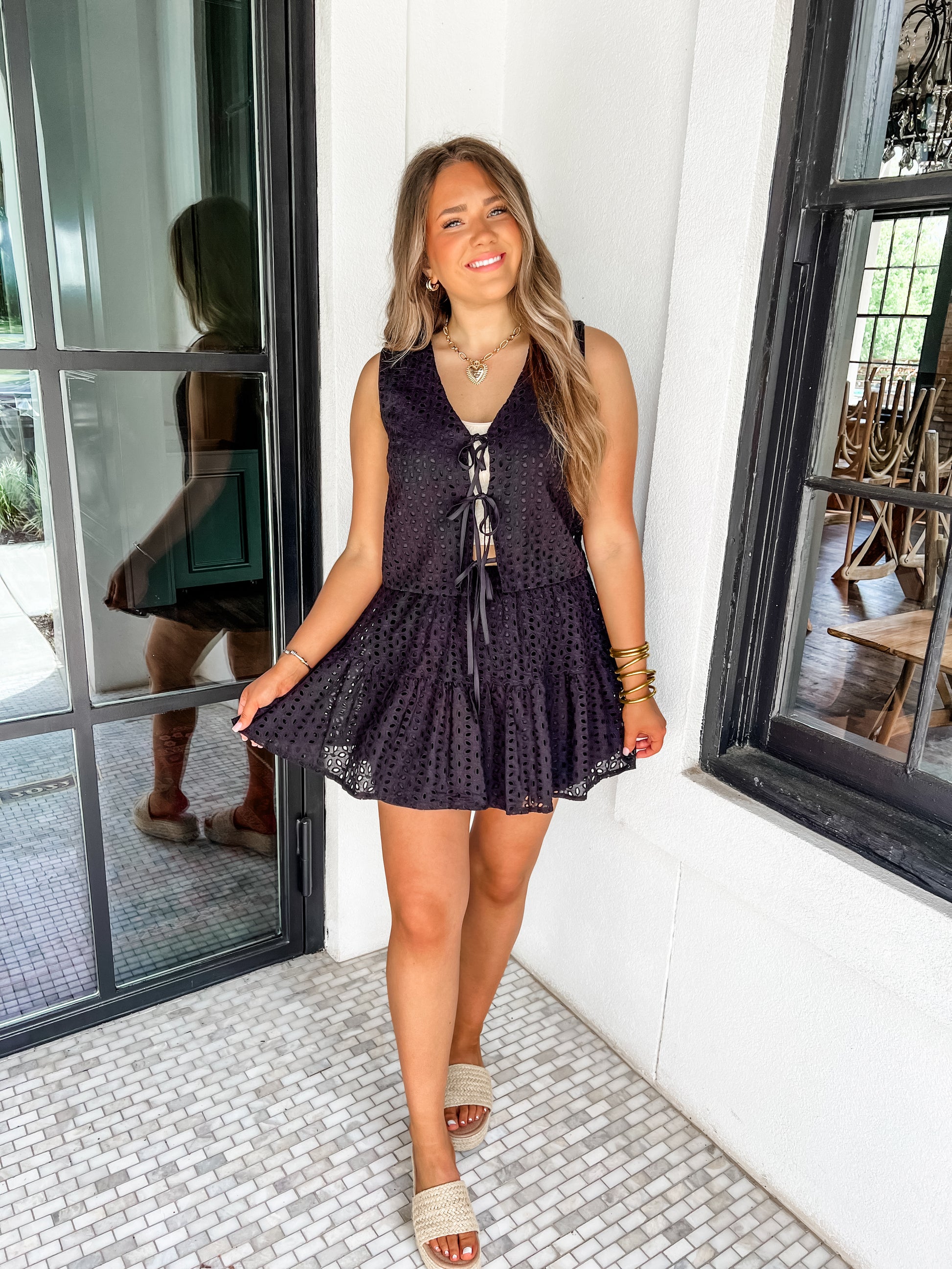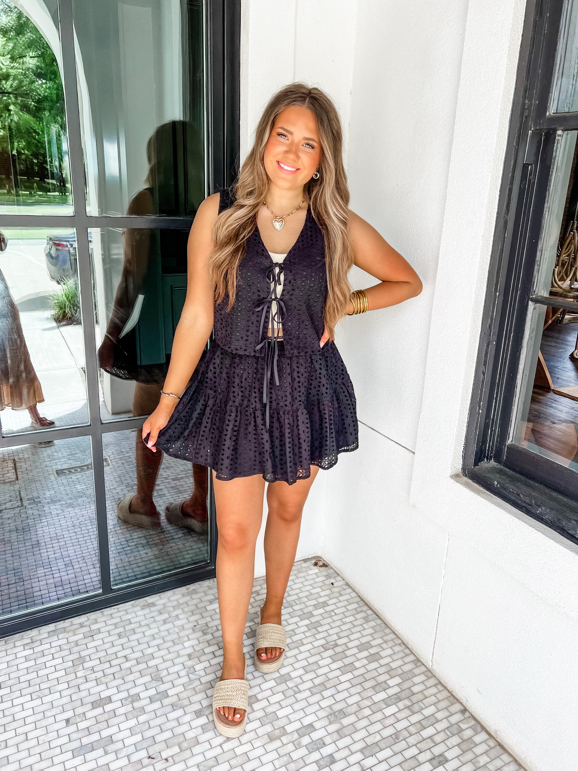 Experience effortless elegance with the dazzling Black Pearl Eyelet Skirt Set. The stunning black eyelet vest features a front tie detail, perfect for accentuating your figure. Paired with the matching tiered mini skirt, this set is sure to make a statement at any event. Elevate your style with this must-have set!