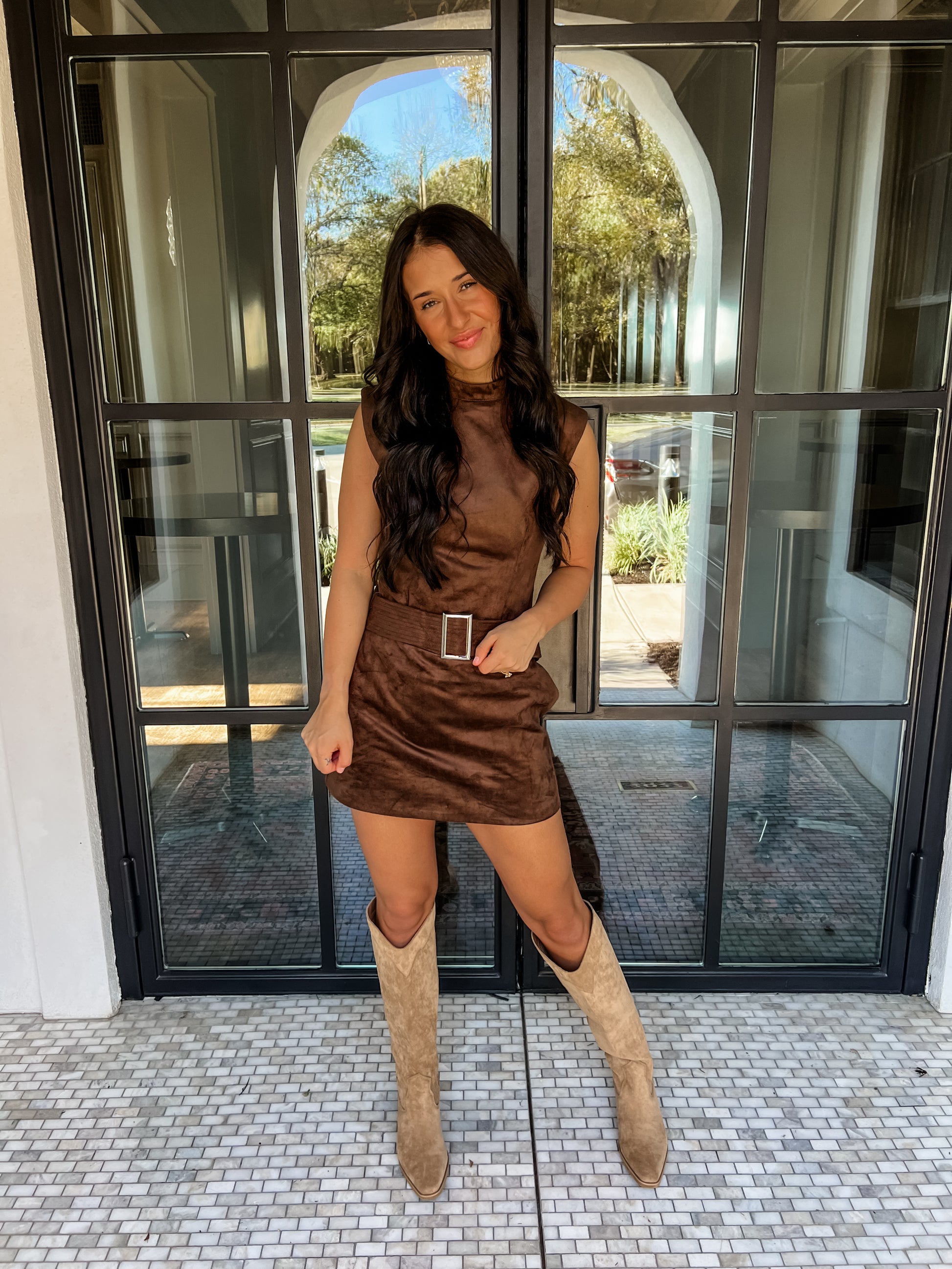 Slip into effortless autumn style with the Bronze Flame Mini. This trendy mini dress features a rich brown hue that's perfect for fall, elevated by a chic silver belt that cinches your silhouette. The playful cut makes it ideal for everything from casual outings to evening adventures. Pair it with your favorite boots or sneakers for a look that's undeniably cute and totally on-trend. A wardrobe essential that transitions seamlessly from season to season.