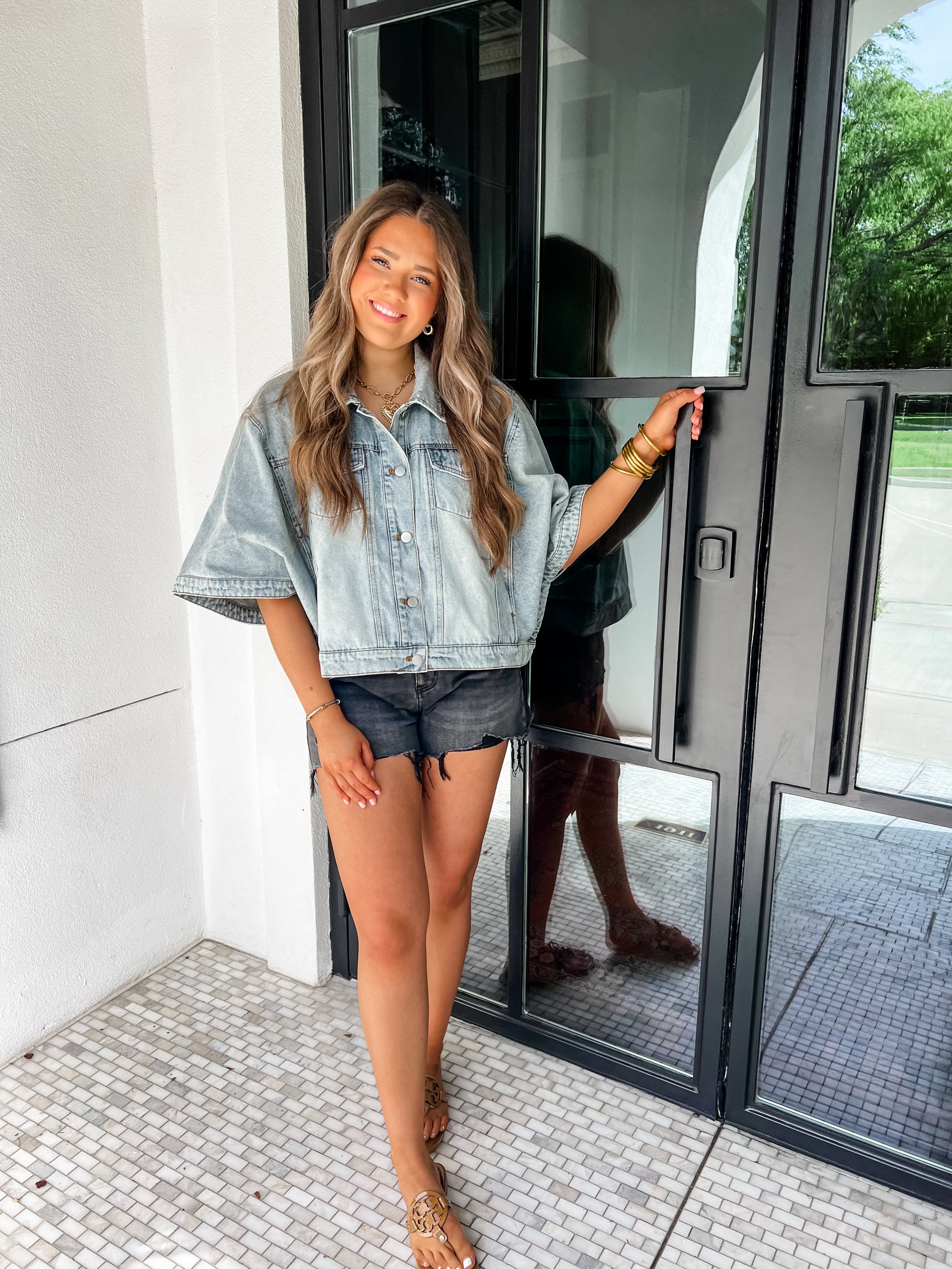 Experience the perfect blend of trendiness and comfort with our Callie Cape Denim Jacket! Its cape style and short sleeves add a touch of style while keeping you cool and comfortable. Upgrade your wardrobe with this versatile and fashionable piece.