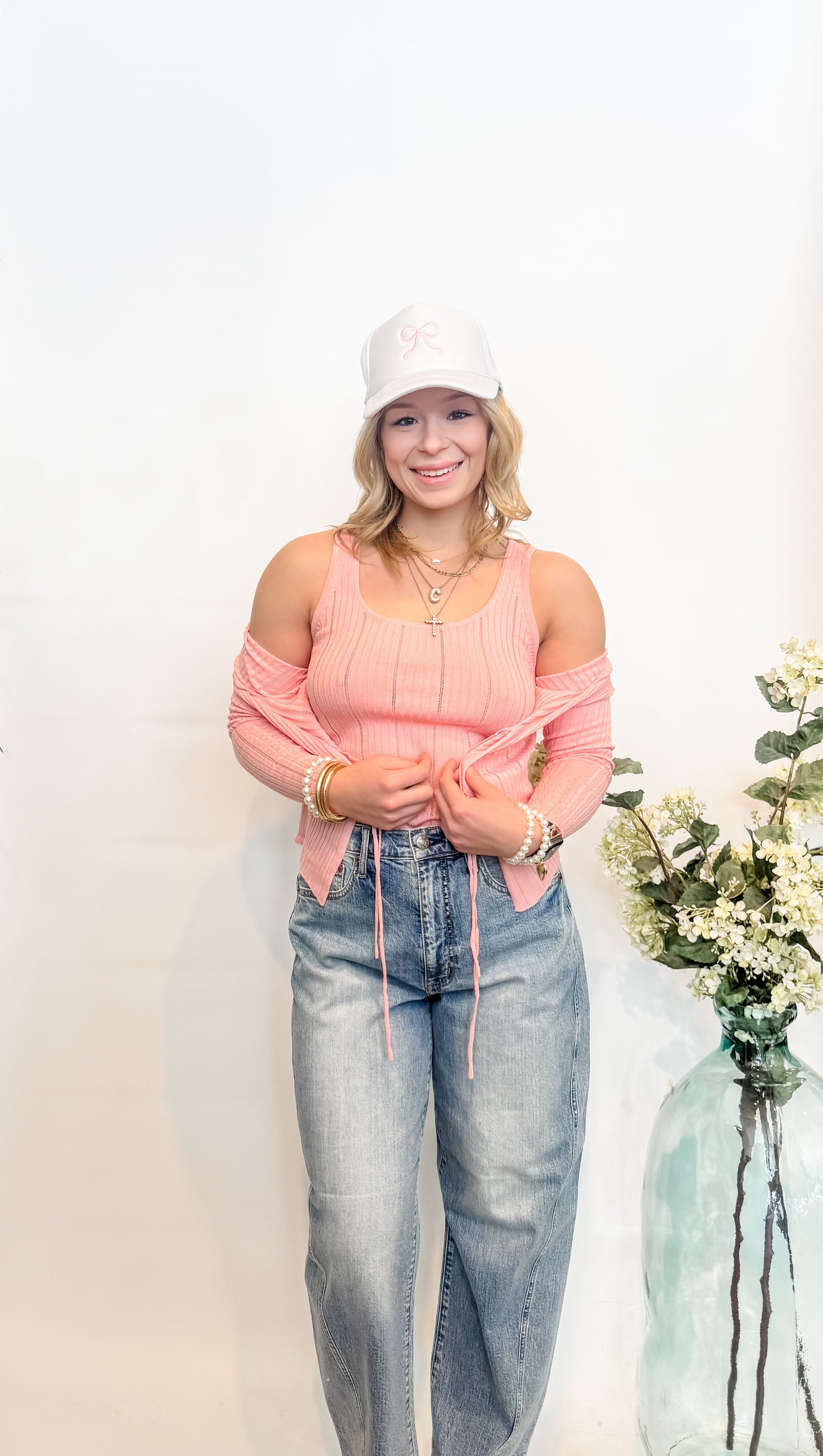 As an expert in fashion, I present to you our Candy Pink Cardigan. Made from lightweight material and featuring stylish ties for closure, this cardigan is the perfect addition to any outfit. For a cute and coordinated look, pair it with the matching sweater tank. Don't miss out on this trendy piece!