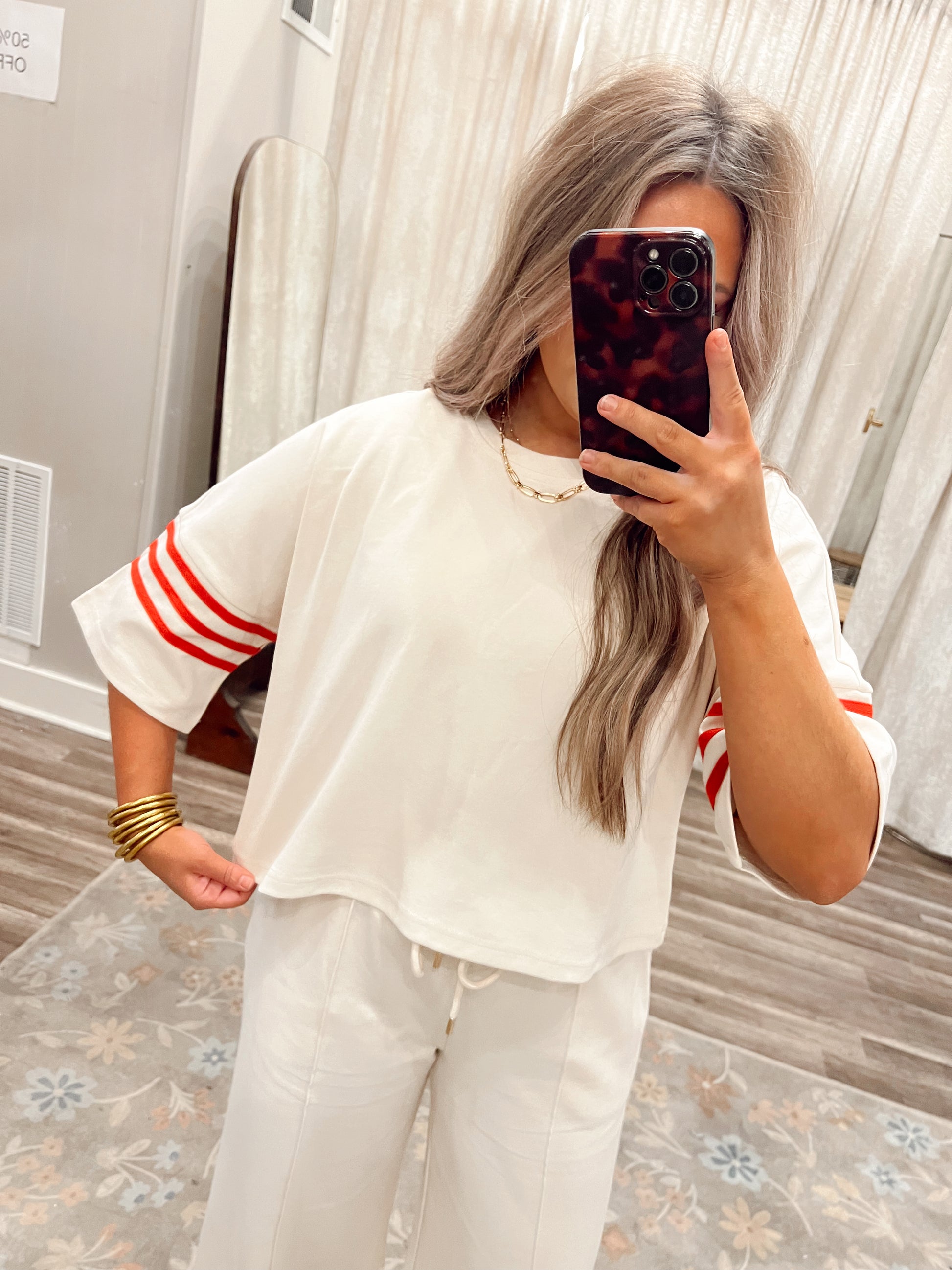 Slip into effortless style with the Cherry Lane Top—a dreamy cream-colored piece that feels as good as it looks. Featuring bold red stripes dancing down the sleeves, this boxy oversized silhouette is pure comfort wrapped in charm. The ultra-soft fabric makes it your new go-to for cozy days and casual adventures. Perfect for layering or wearing solo, it's the kind of top that makes getting dressed feel like fun.