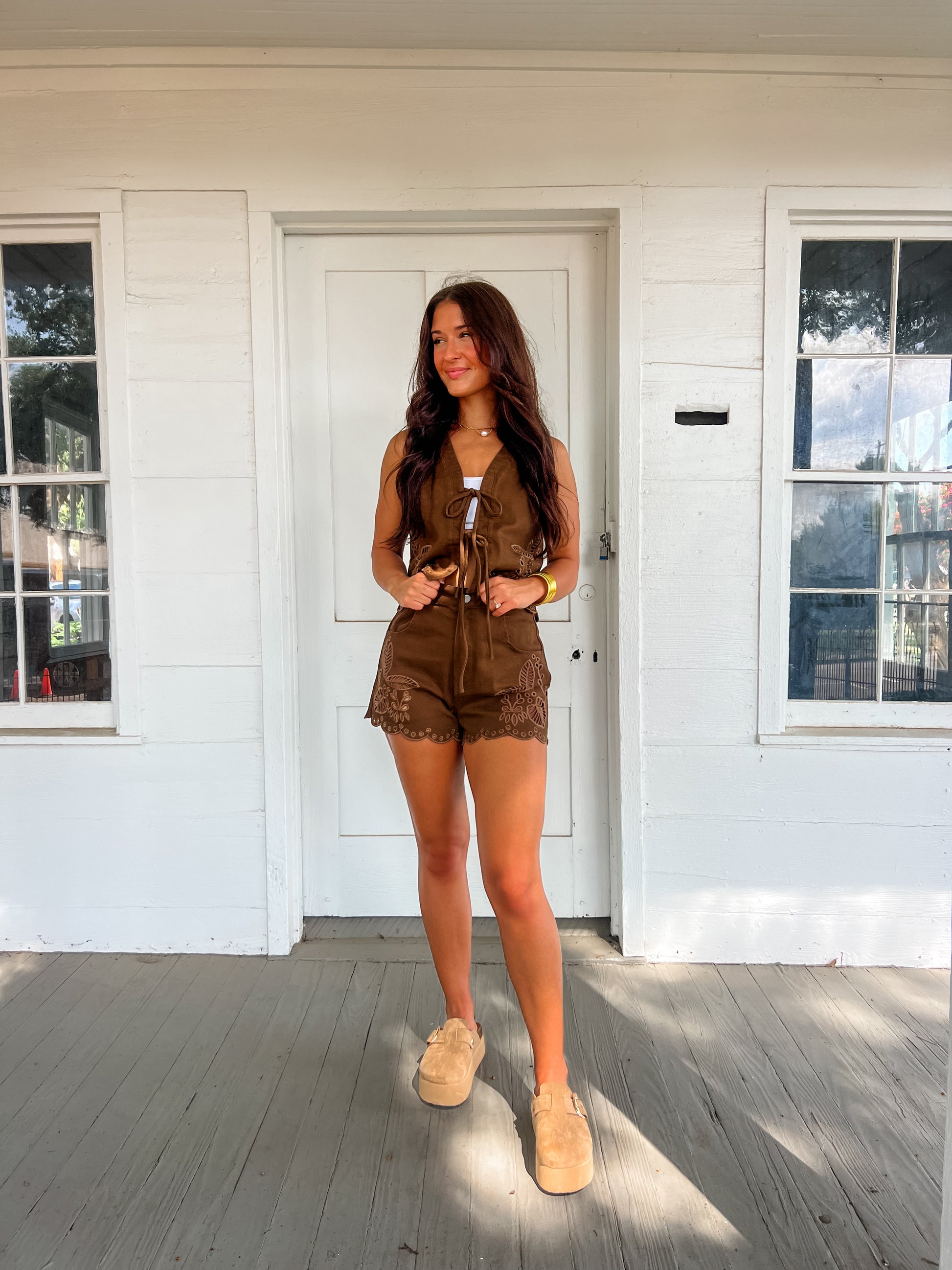 These chocolate brown embroidered shorts bring a playful touch to any outfit. Perfectly detailed and irresistibly cute, they pair beautifully with the matching vest to create the ultimate coordinated look. Embrace comfort and style with this delightful set made for fun days and sweet moments.