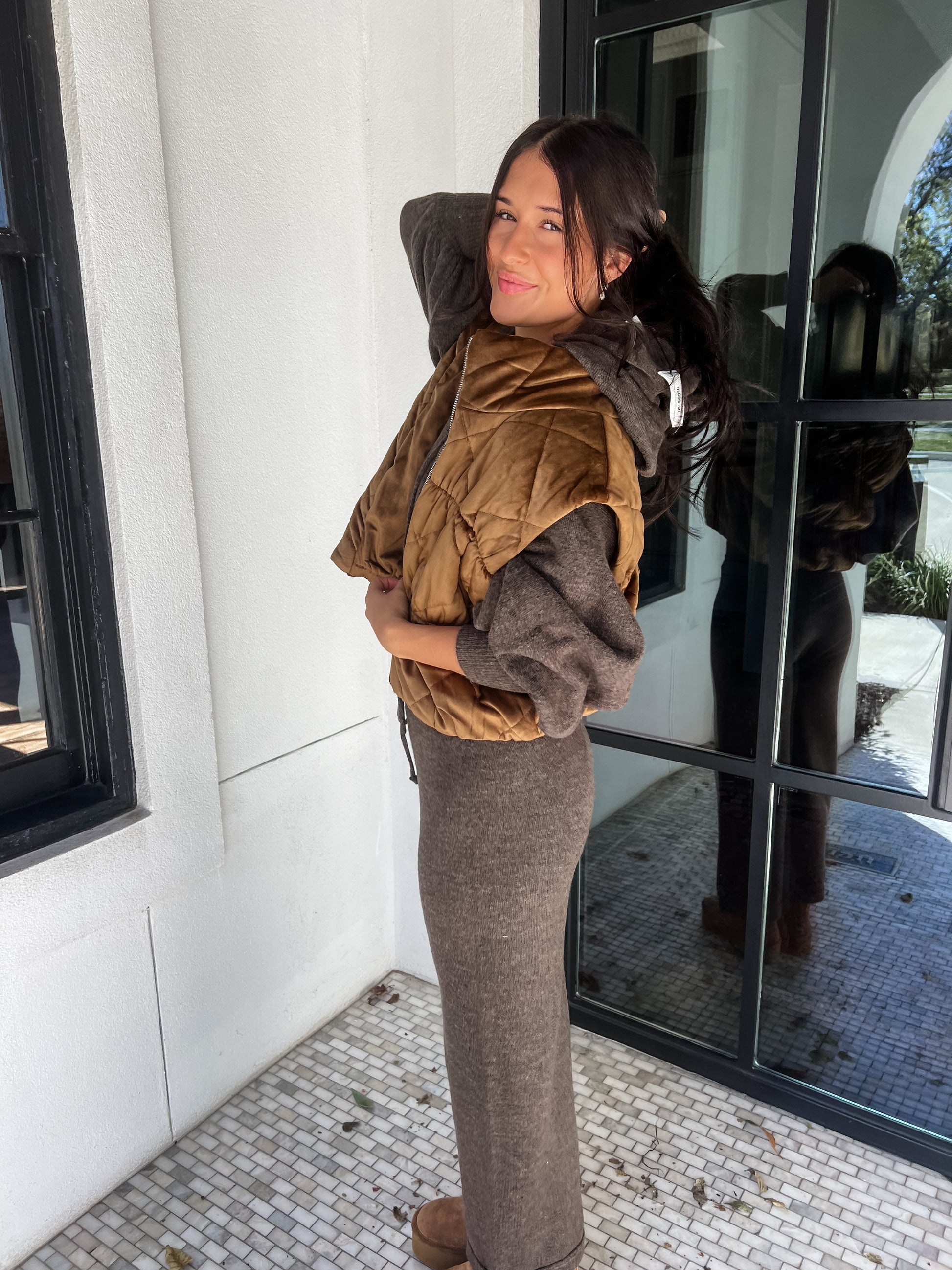 Wrap yourself in cozy charm with the Cosmic Quilted Vest. This golden olive, quilted velvet vest features a sleek zip front, making it the perfect playful layer for chilly days. Its soft texture and vibrant hue add a fun twist to your outfit while keeping you comfortably warm.