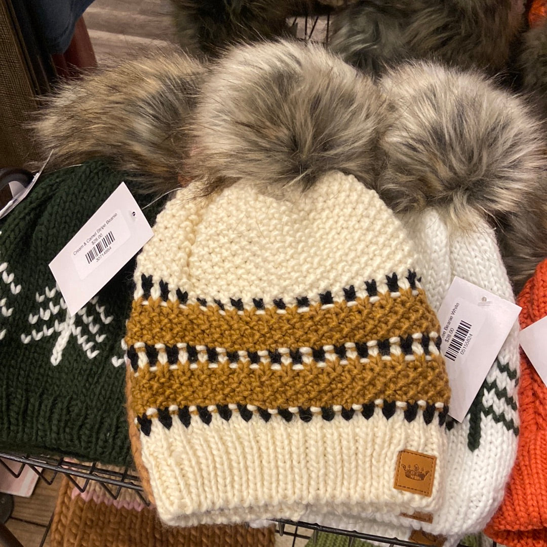 Stay warm in this chunky crochet beanie! Its cream and camel-striped design adds a touch of style to any winter outfit. Go ahead, beat the cold and keep your head cozy with this cream & camel stripe beanie. #StayStylishlyWarm!