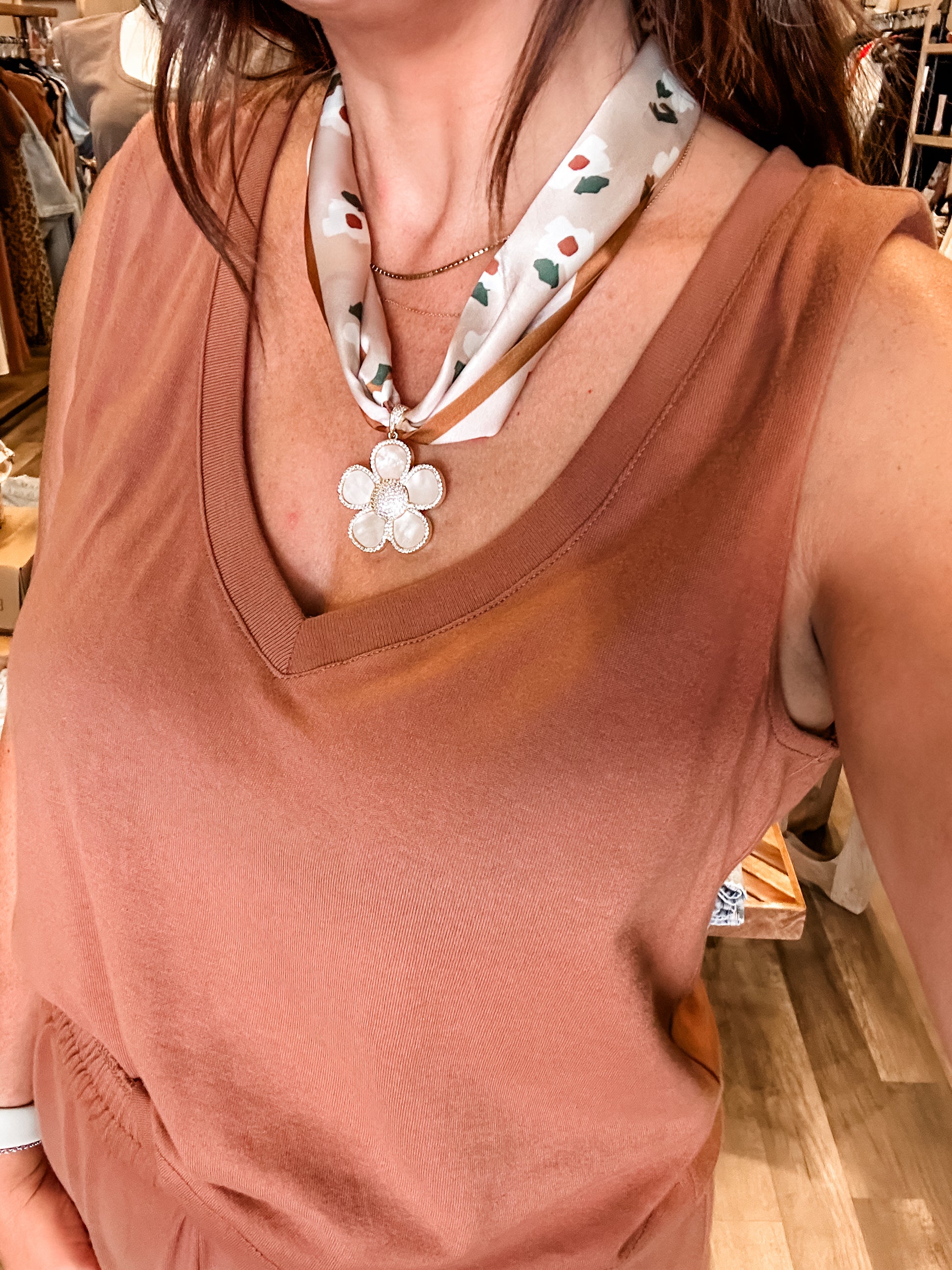 Add a whimsical touch with our Daisy Charm Scarf Necklace in warm brown tones. Featuring a delicate opal daisy charm, this playful accessory is self-tie and fully adjustable, letting you style it just the way you like. Perfect for adding a splash of charm and color to any outfit!