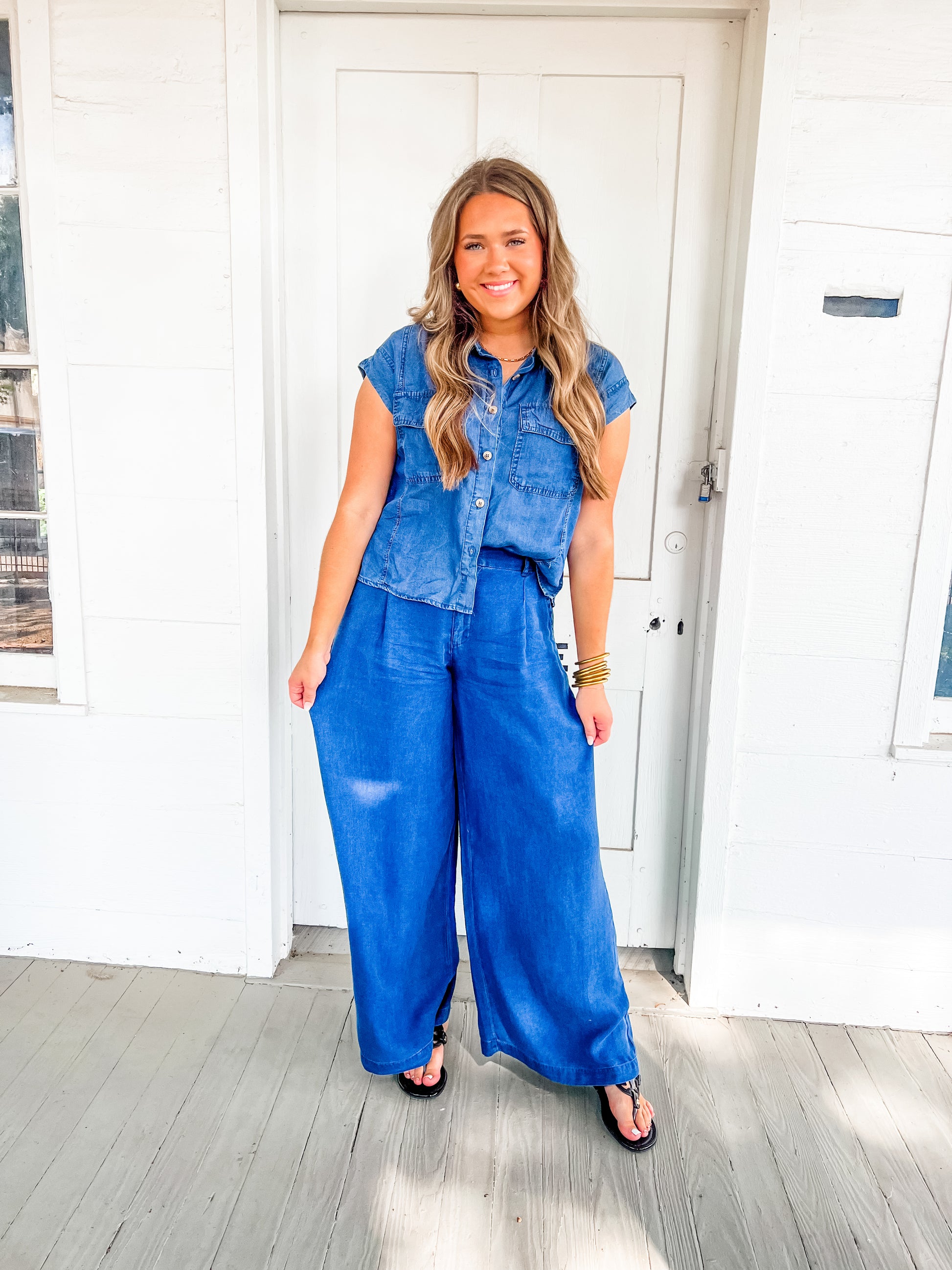 This super soft, short sleeve button-up top in a dark chambray wash is your new go-to for effortless style. Light and comfy, it pairs perfectly with the matching pants for a look that’s both relaxed and put-together. Ready to play with your wardrobe? This top’s got you covered!