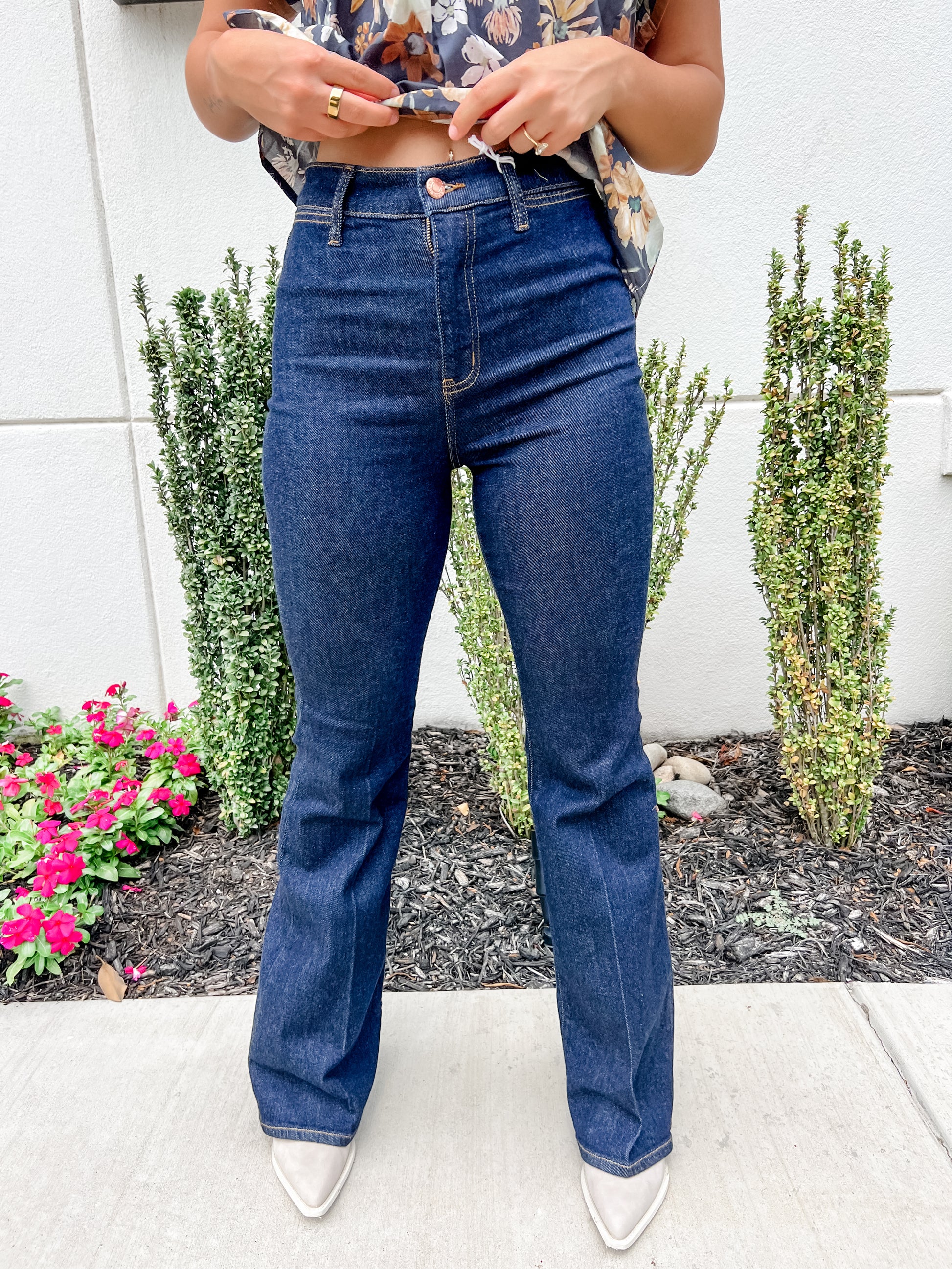 Step out with confidence in the Daze Flare jeans—featuring a flattering high waist and a dark denim flare that adds a touch of retro charm. Perfect for dancing through your day or turning heads at your next outing, these jeans combine comfort and style with a playful twist. Elevate your wardrobe effortlessly!