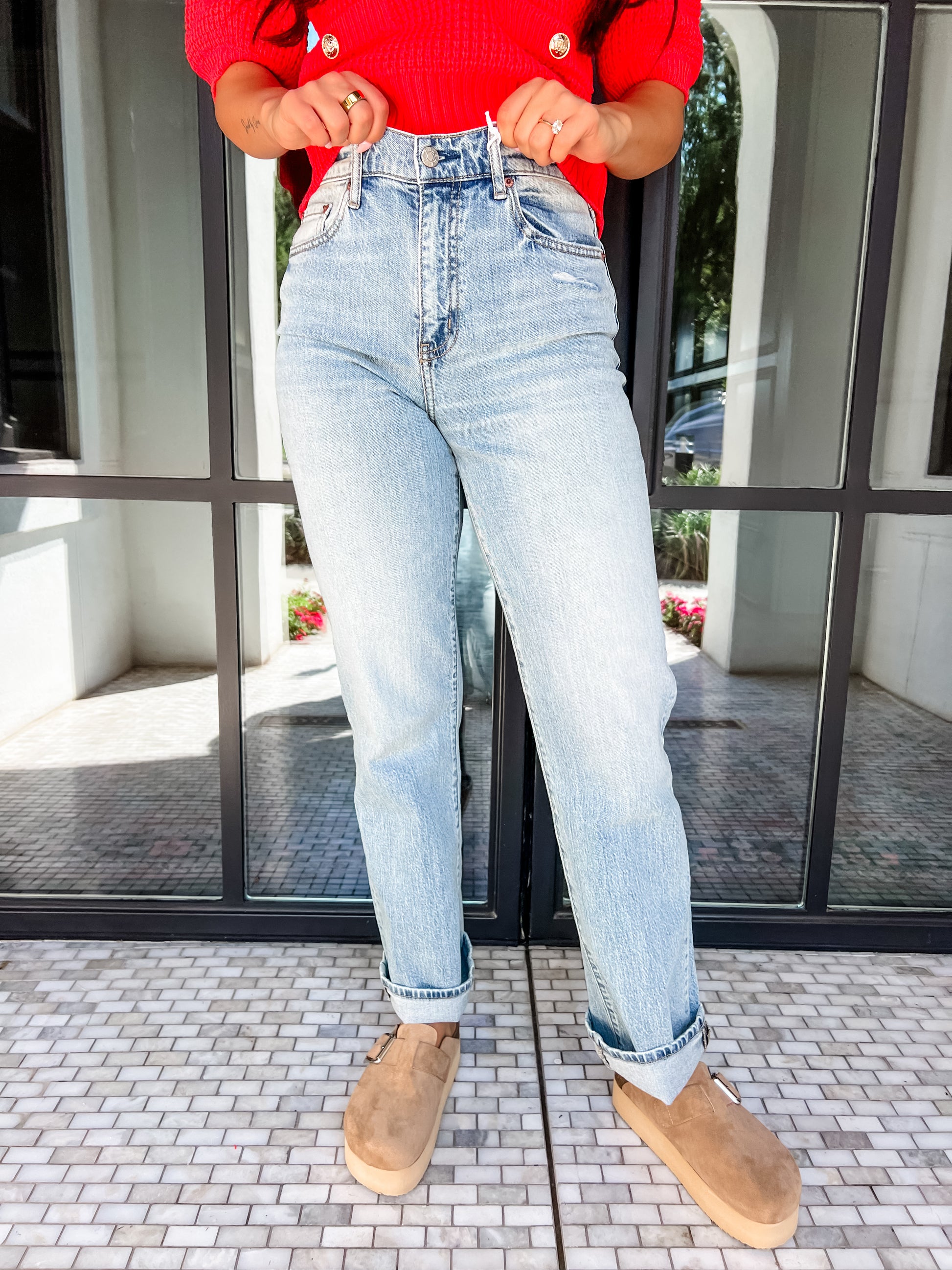The Sundaze in Bliss is a vintage-inspired high rise straight leg in a dreamy light wash. Pair with a pointelle top for a timeless model-off-duty look. This vintage-inspired jean is constructed from our Tough Love fabric, which is mostly rigid but yields to your body in all the right ways.
