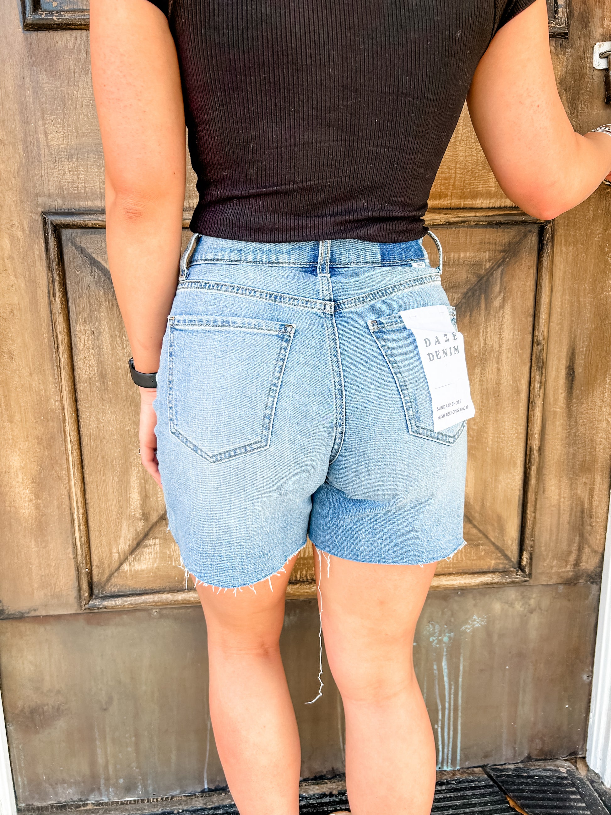 Spend your days in comfort and style with SunDAZE shorts. Designed with a high rise and a flattering mom fit, these shorts provide a relaxed yet chic look. Complete with a trendy slightly distressed finish, these long shorts are perfect for your summer wardrobe.