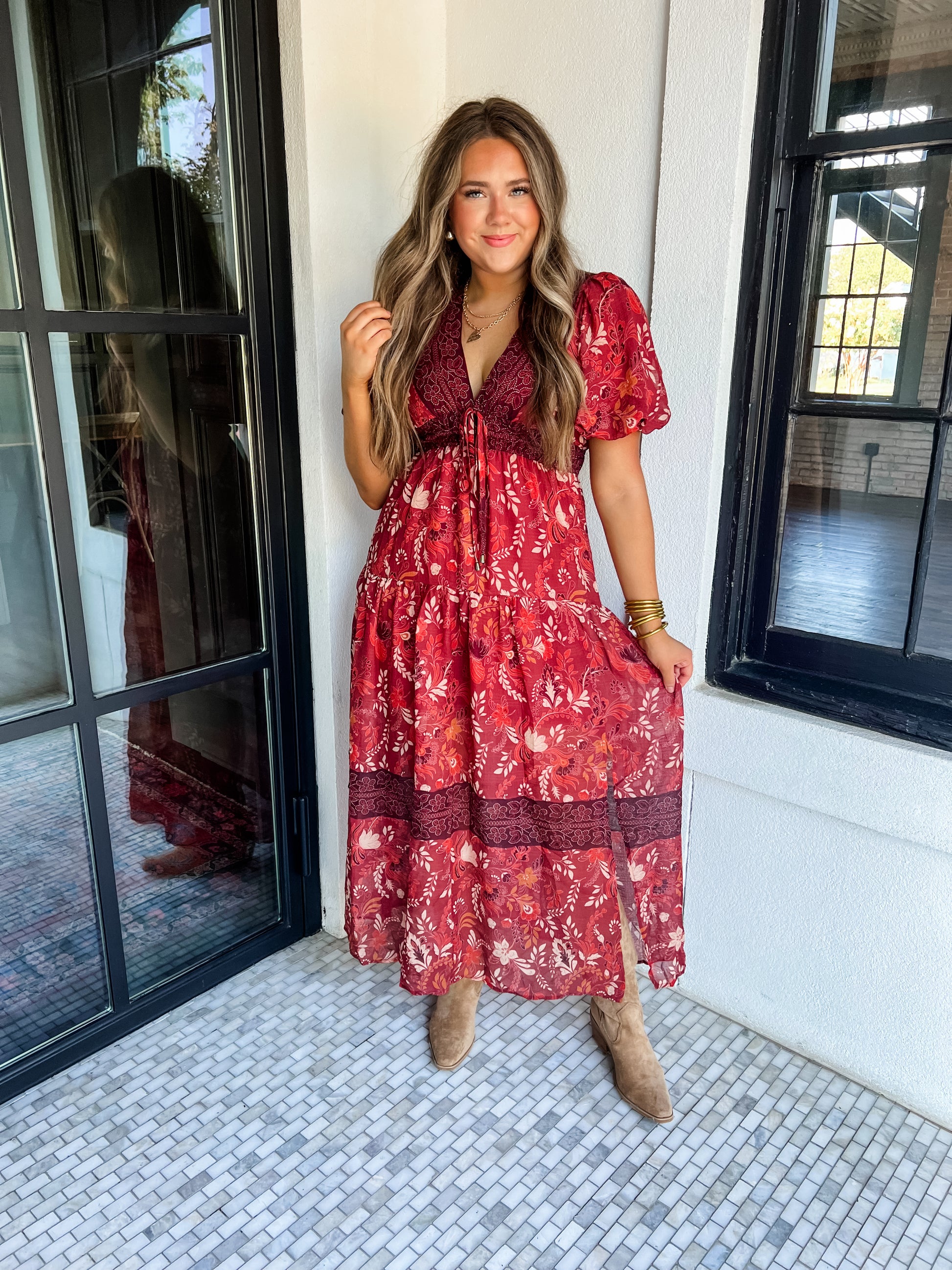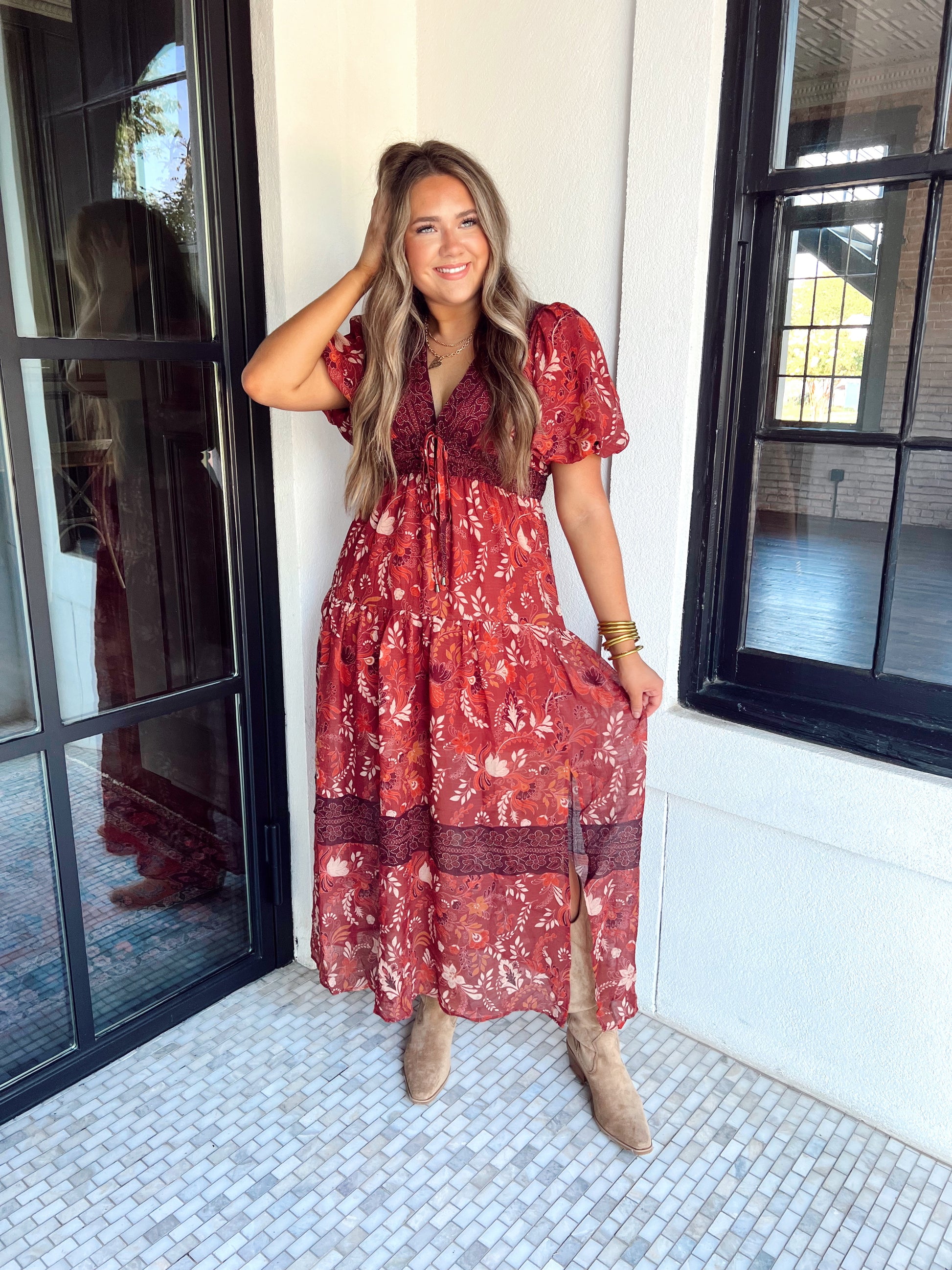 Step into effortless charm with this Deep Rust Floral Dress. Made from soft, rust-colored fabric adorned with lively floral patterns, its short sleeves and flowing maxi length offer a breezy, playful vibe perfect for sunny days or relaxed evenings. This dress brings a touch of whimsy to your wardrobe while keeping comfort front and center.
