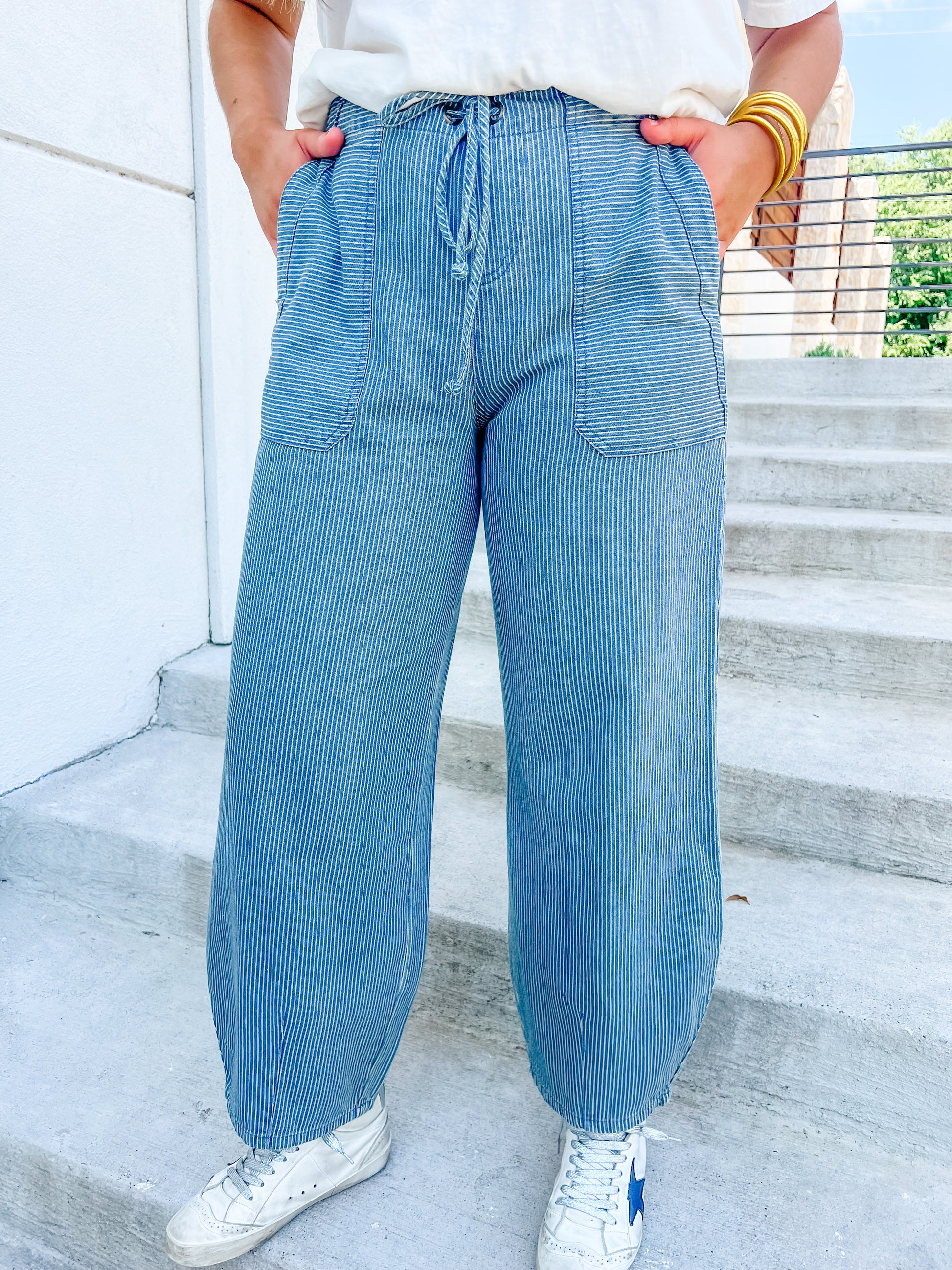Step into style with these playful denim pinstripe pants! Featuring a subtle pinstripe pattern and a fun tie at the waist, they add a flirty twist to classic denim. Perfect for mixing comfort with a dash of flair, these pants are your new go-to for casual days with a stylish edge.