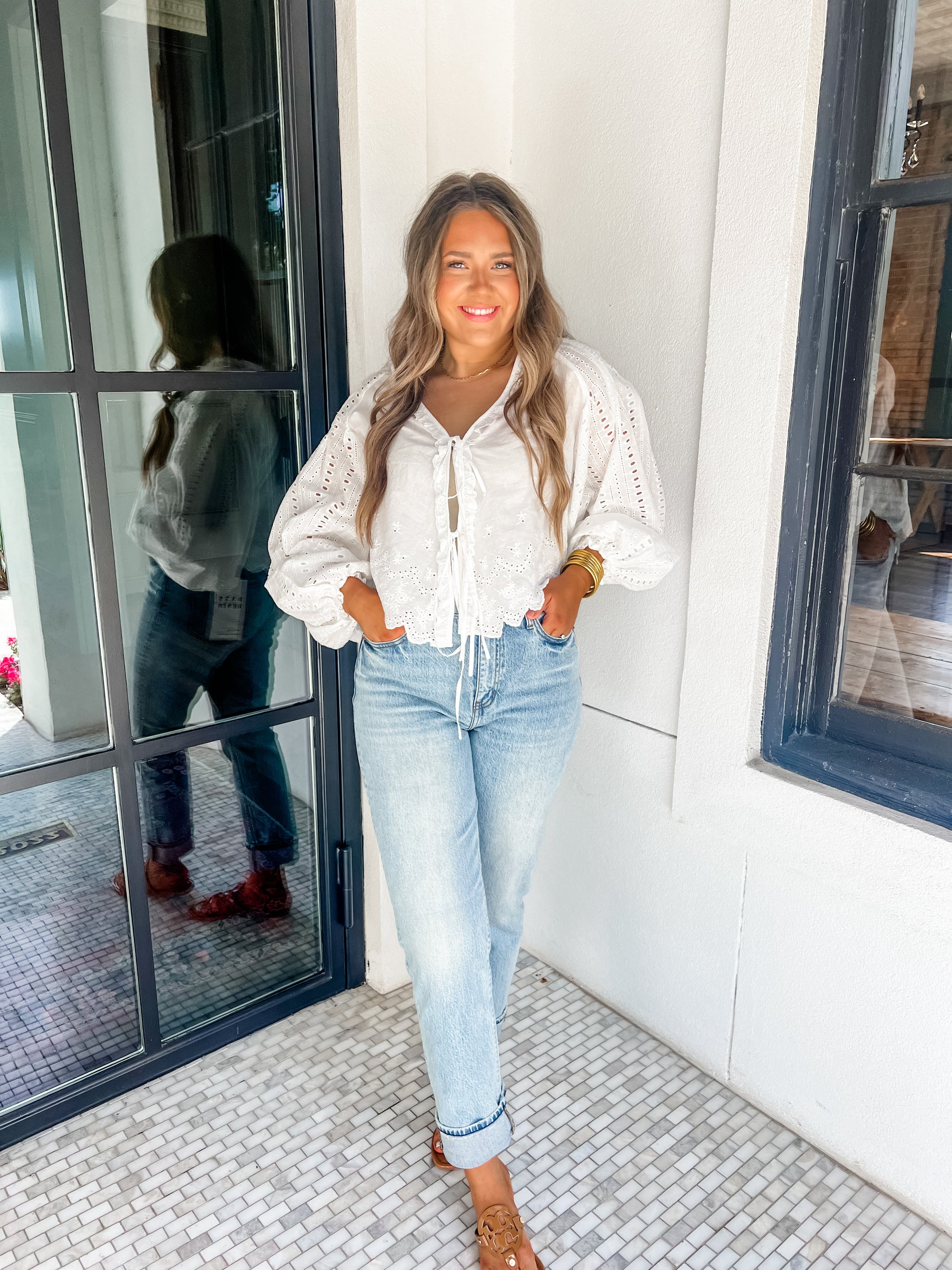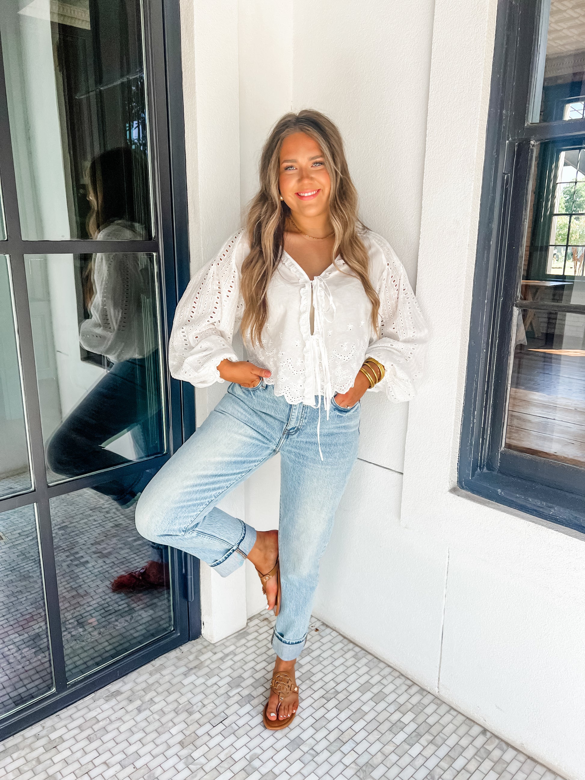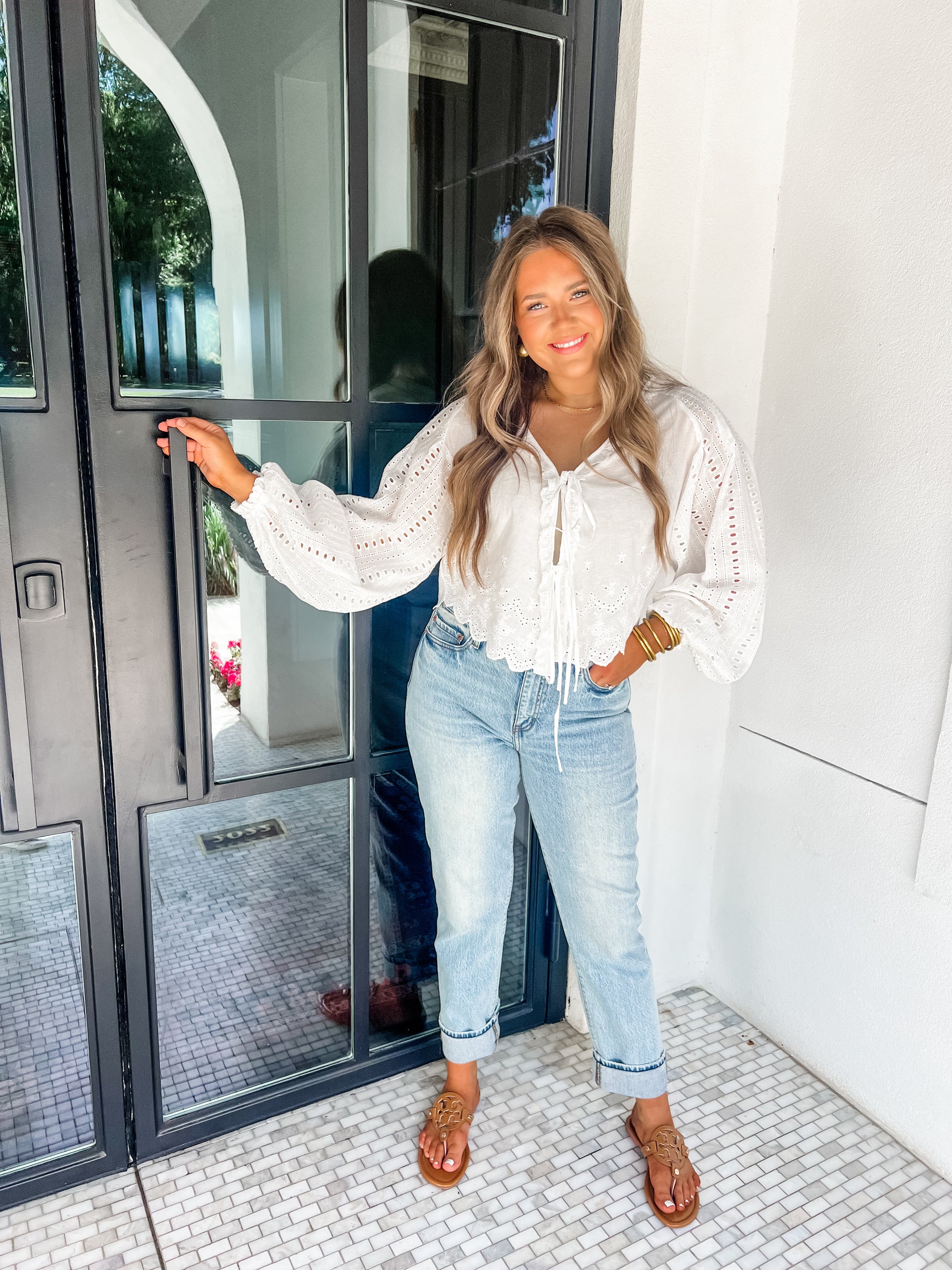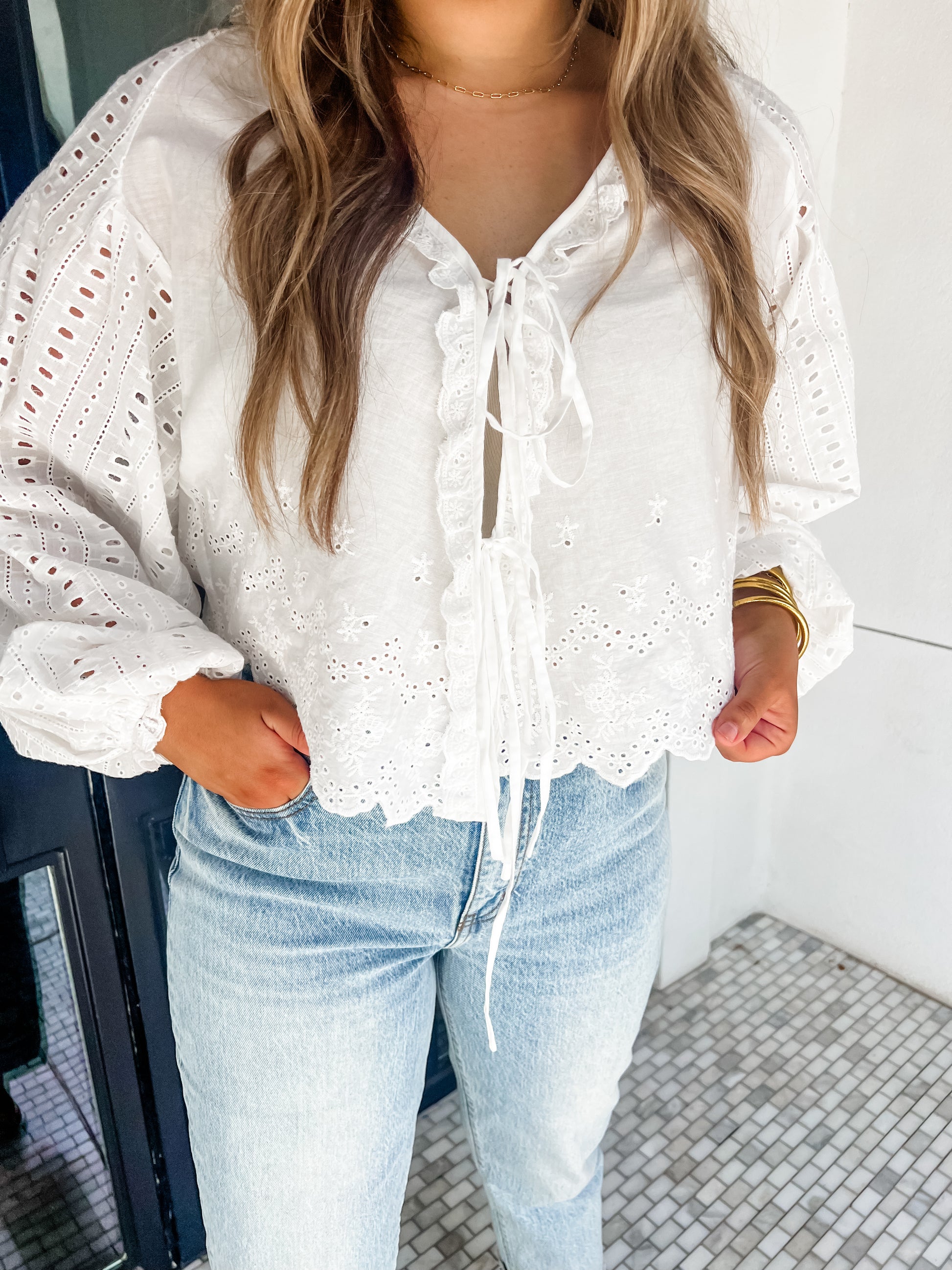 Embrace the last days of summer with the End Of Summer Wishes Top. This white eyelet blouse features a charming front tie and long, flowy sleeves that add a playful, feminine touch to your look. Light and breezy, it’s perfect for sunny afternoons and warm evenings, making every moment feel fun and effortless.