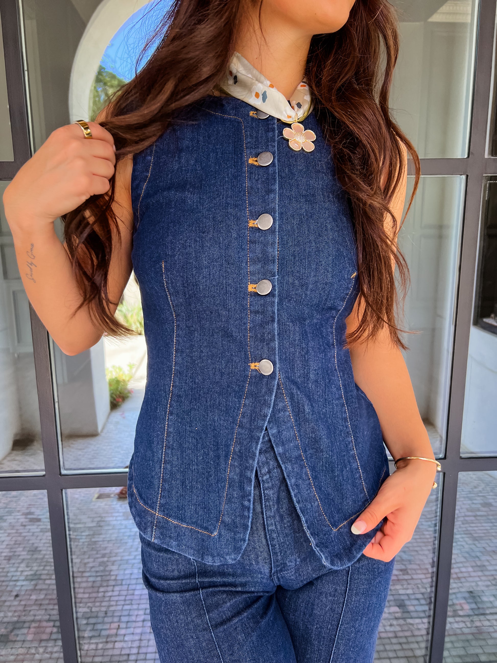 Add a touch of cool to your fall brunch outfit with this dark denim sleeveless vest. Featuring buttons down the front and a trendy split hem, it’s the perfect layering piece to pair with your favorite fall brunch date pants. Effortlessly stylish and playful, this vest brings a fresh twist to your seasonal wardrobe.