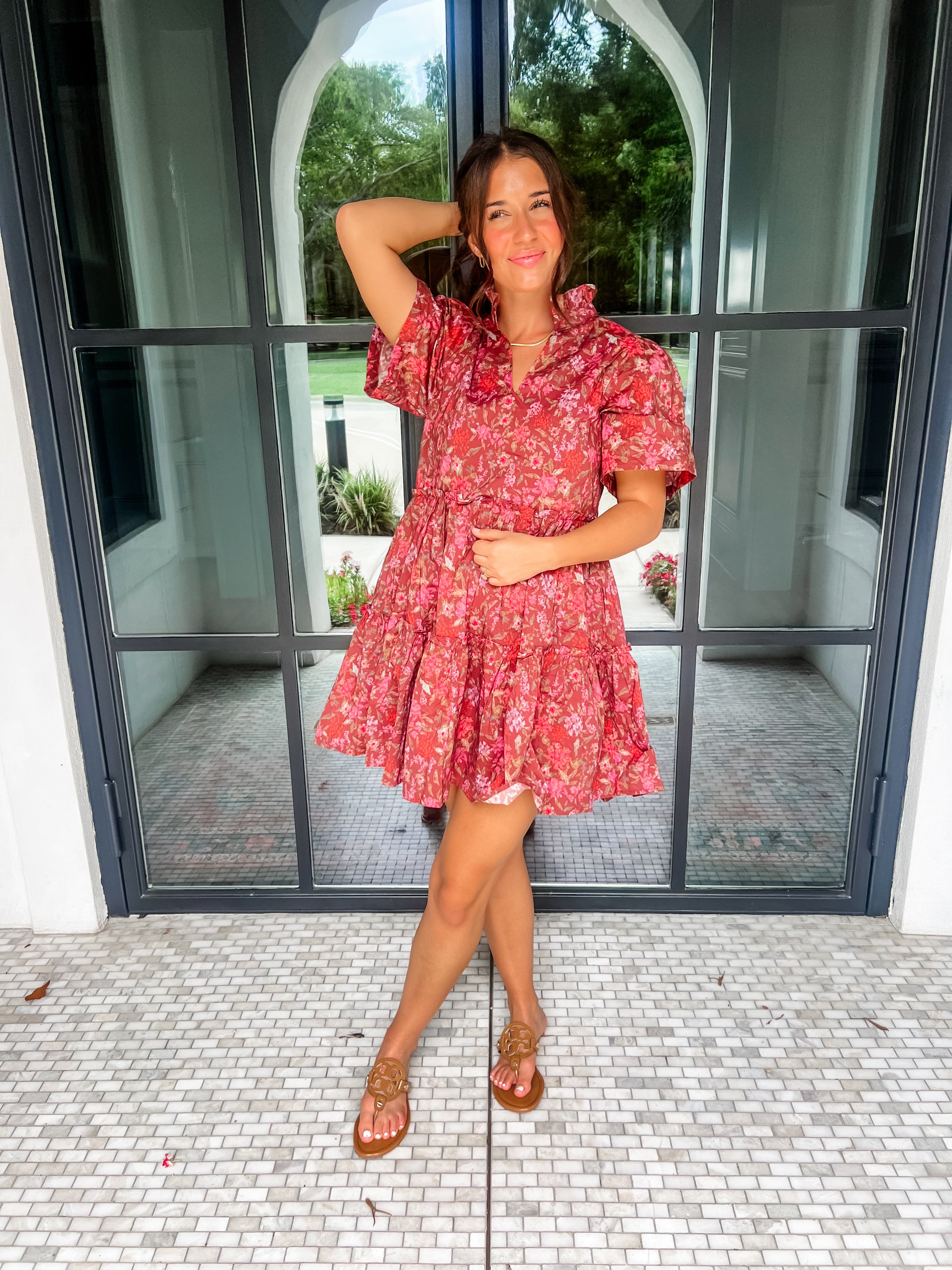 This playful mini dress features a tiered ruffle skirt and charming puff sleeves, creating a fun and flirty silhouette. Its deep V-neck adds a touch of allure, while the cocoa brown base is beautifully adorned with vibrant red and purple flowers and lush green foliage, perfect for embracing the spirit of fall with style and whimsy.