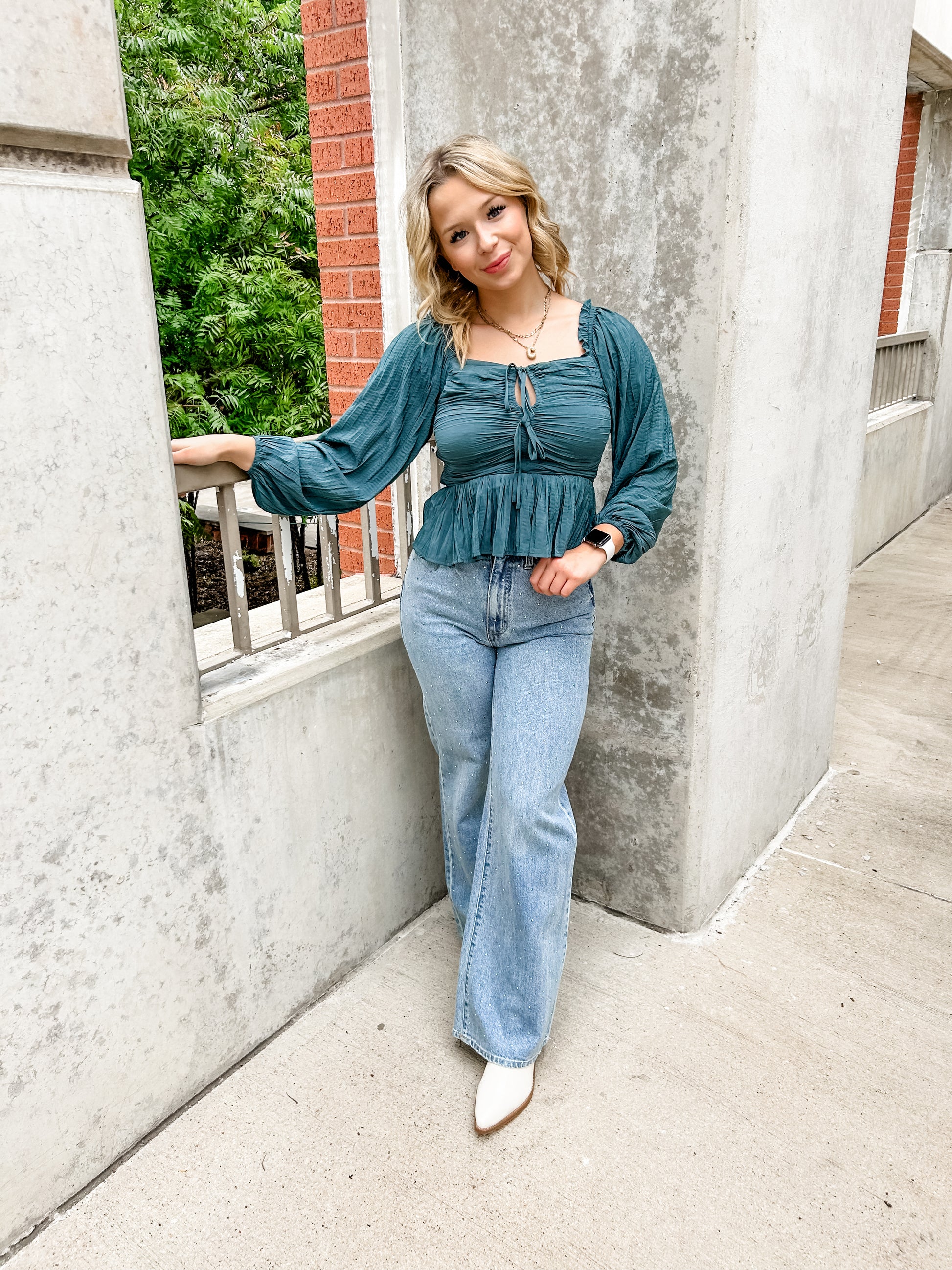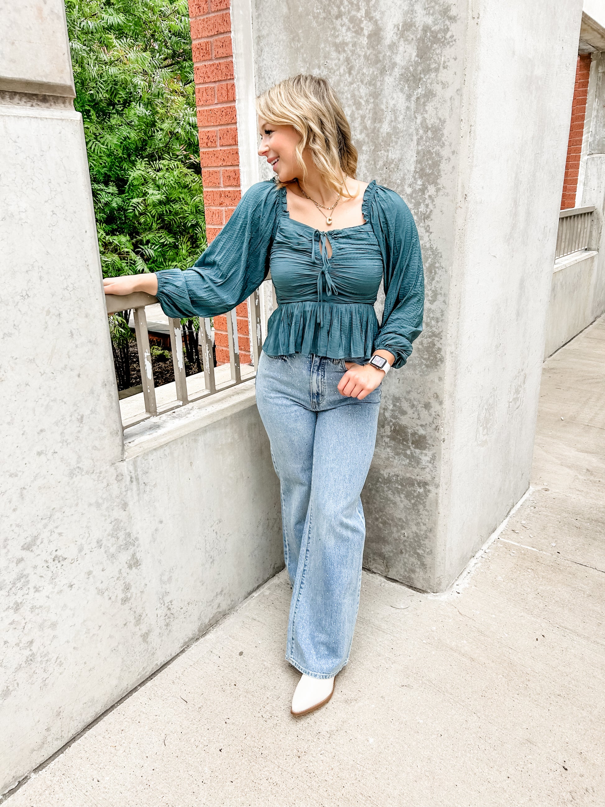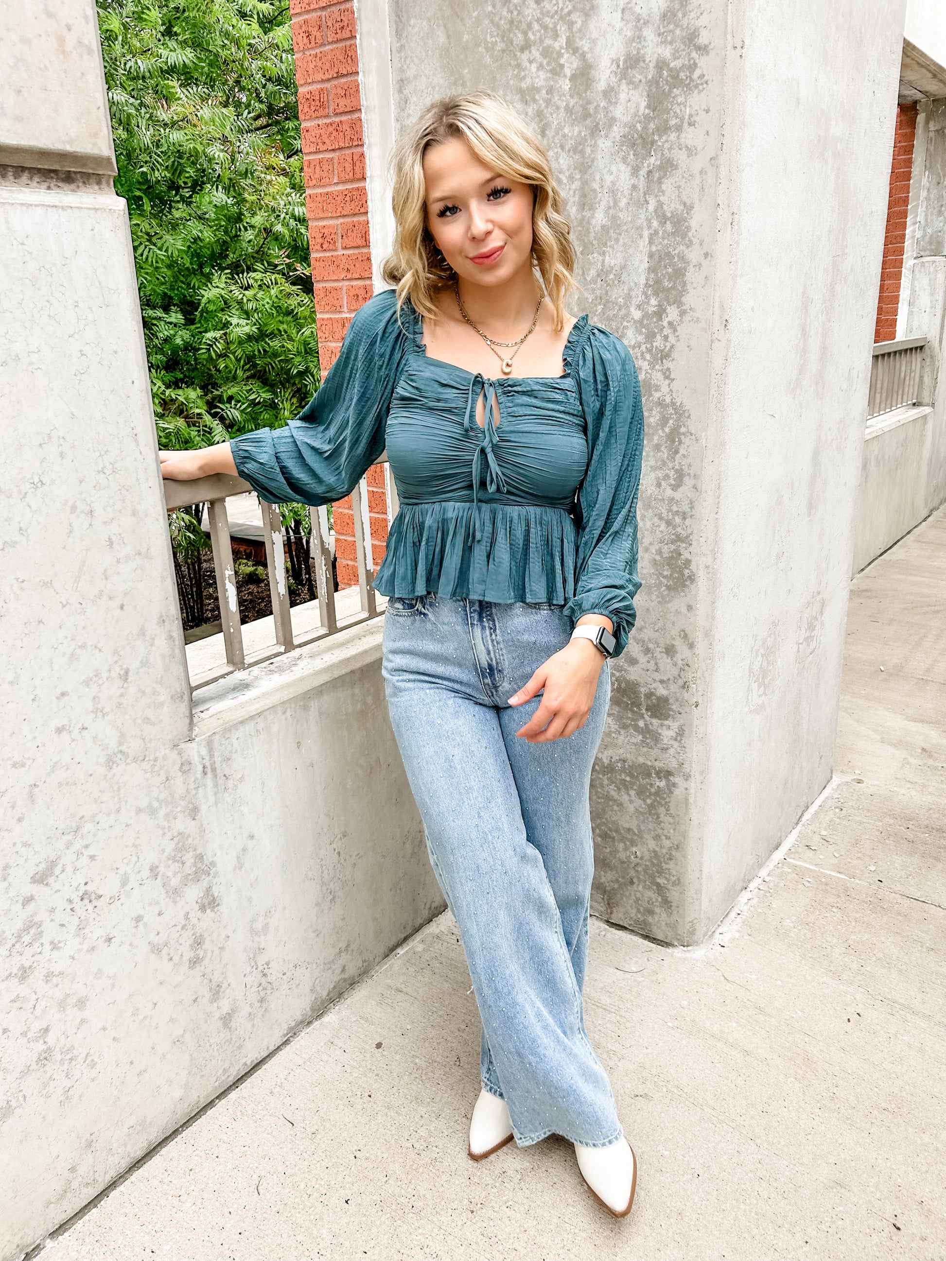 Expertly designed with a flattering teal ruched top and feminine ruffle detail, this Flirty Teal Top is the perfect addition to your wardrobe. Pair it with your favorite jeans for a chic and stylish look. Elevate your style game with this must-have top.