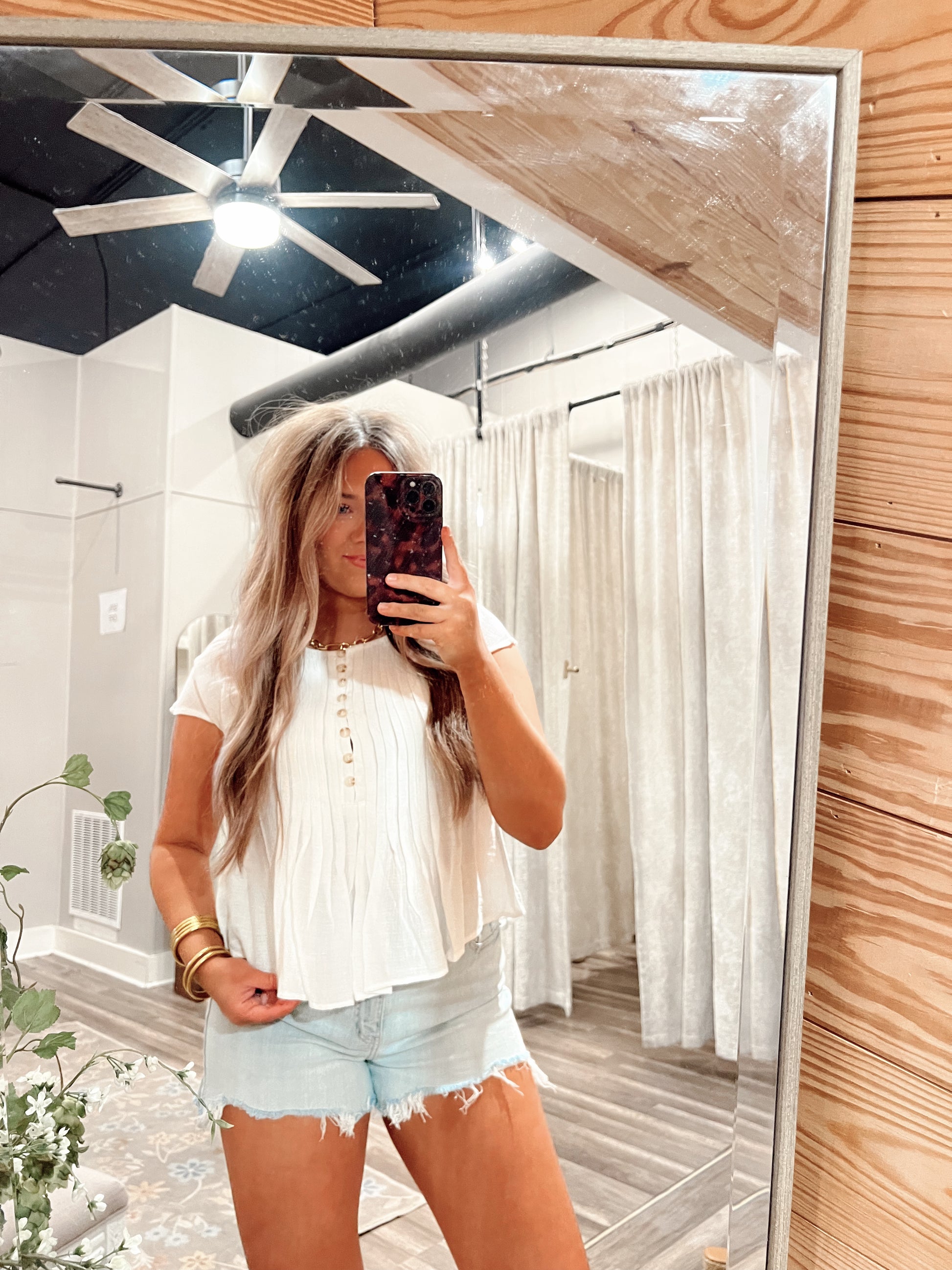 The Free Feeling Top is your new go-to for effortless style. This playful piece features a relaxed drop shoulder silhouette that feels as good as it looks, paired with charming half button details and pin tuck accents for visual interest. The pleated chest adds dimension and movement, creating a flattering fit that moves with you. Perfect for casual days when you want comfort without compromising on personality.