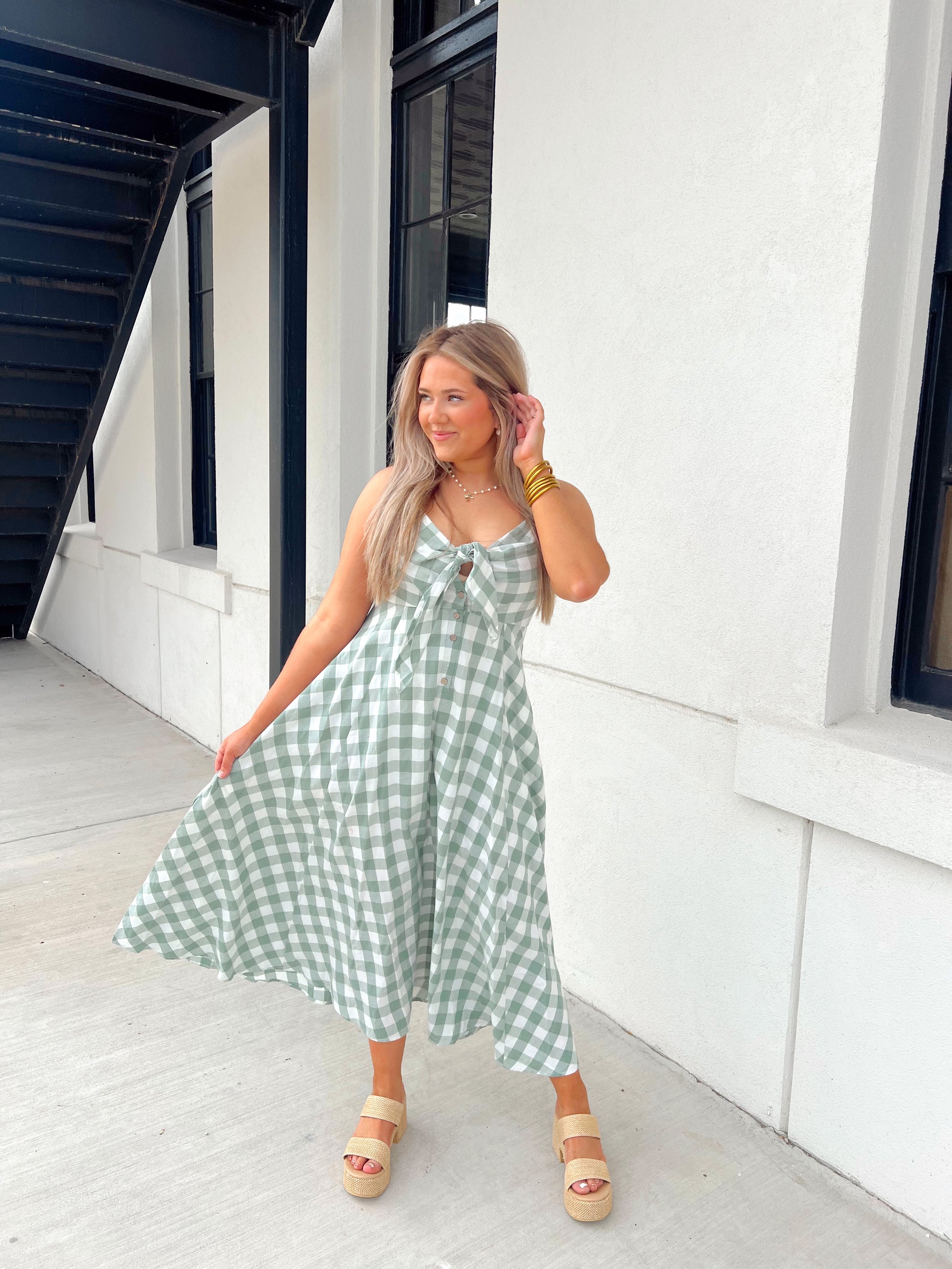 Embrace effortless spring style with the Ivy Lane Dress, a charming long gingham design in soft basil tones. Featuring adjustable straps for a customized fit, delicate brown buttons down the front, and an adorable bow accent, this dress combines vintage-inspired details with modern comfort. The springy fabric moves beautifully with you, making it perfect for garden parties, casual outings, or weekend adventures. A versatile wardrobe essential that transitions seamlessly from season to season.