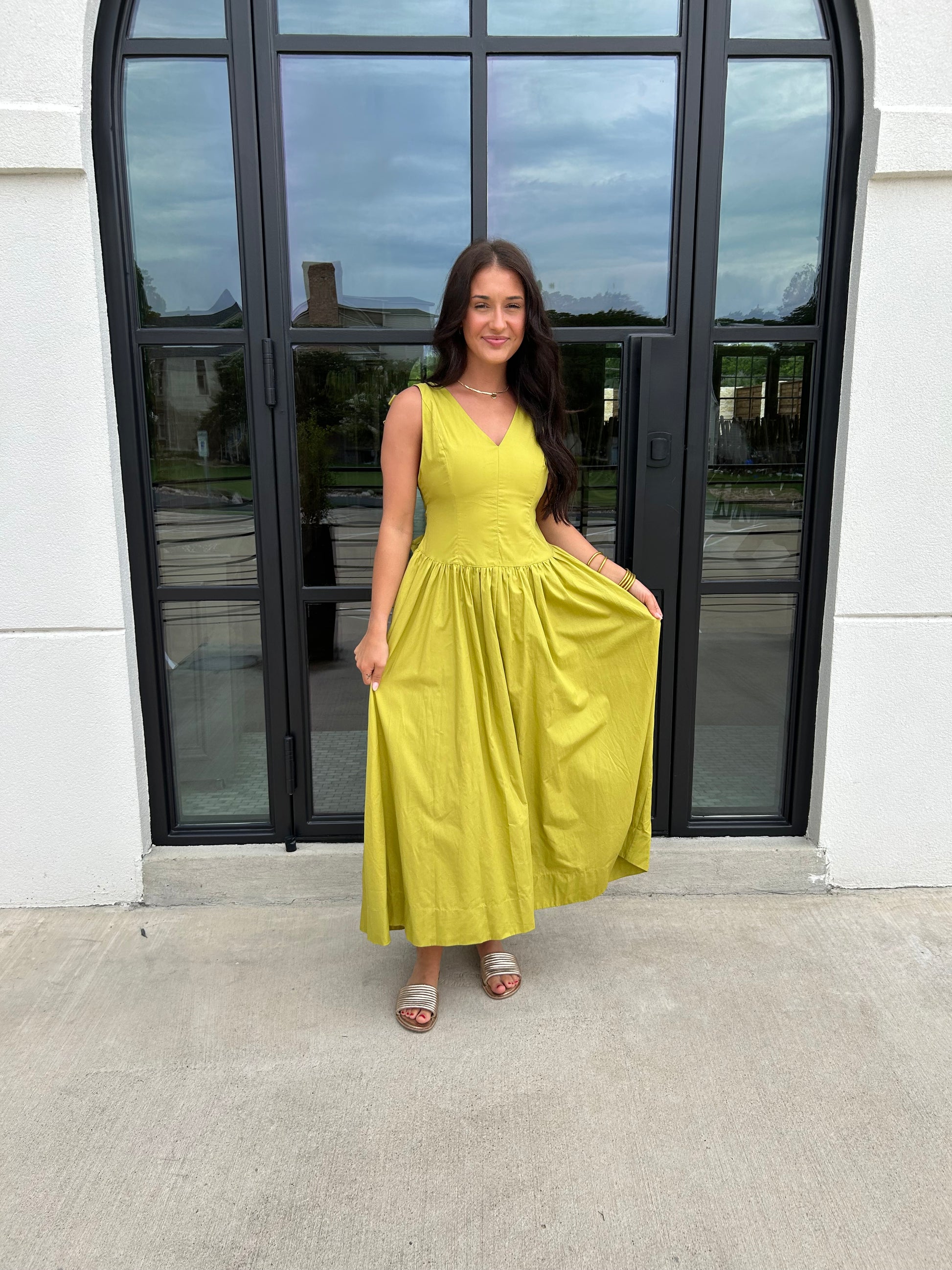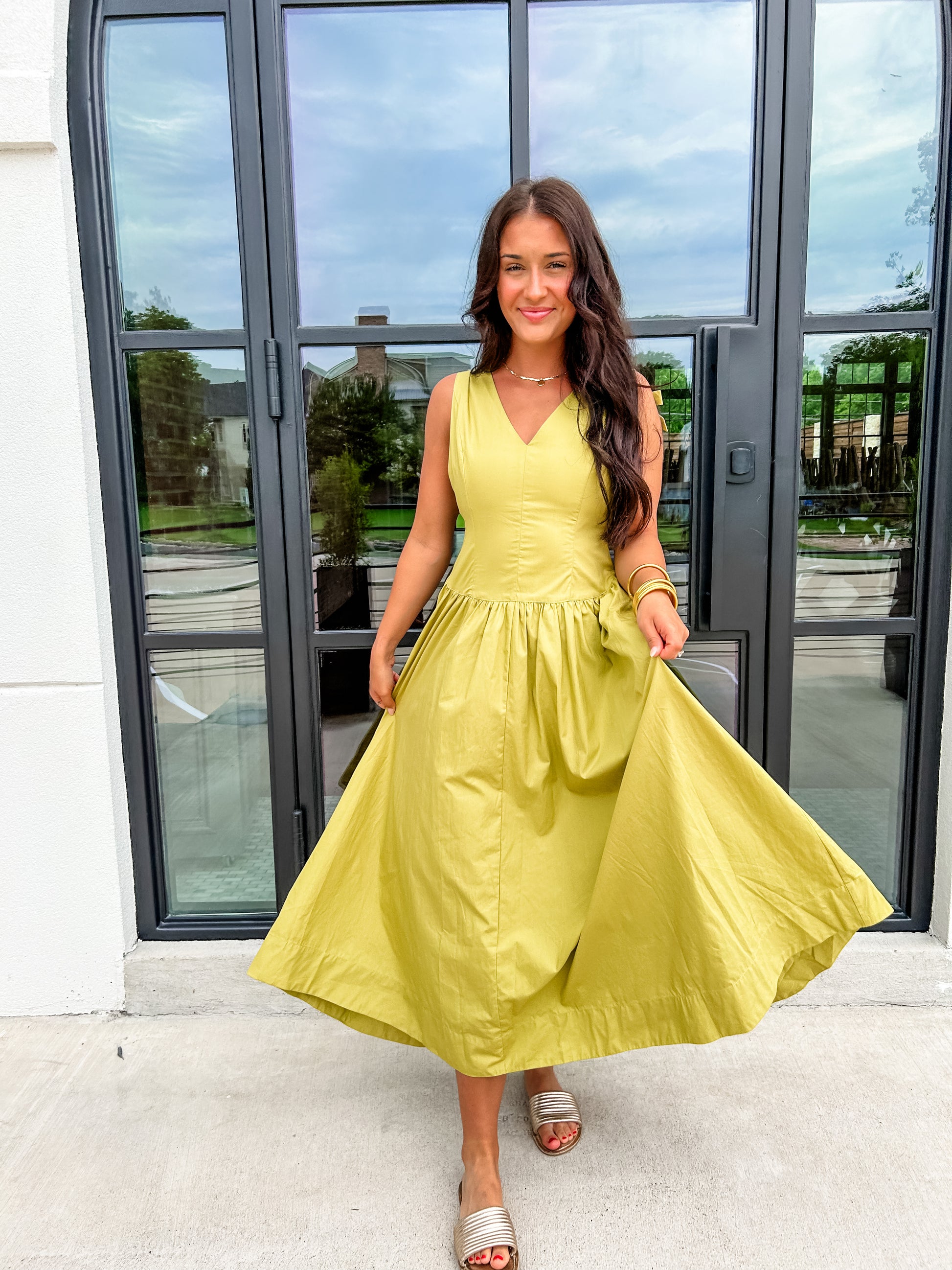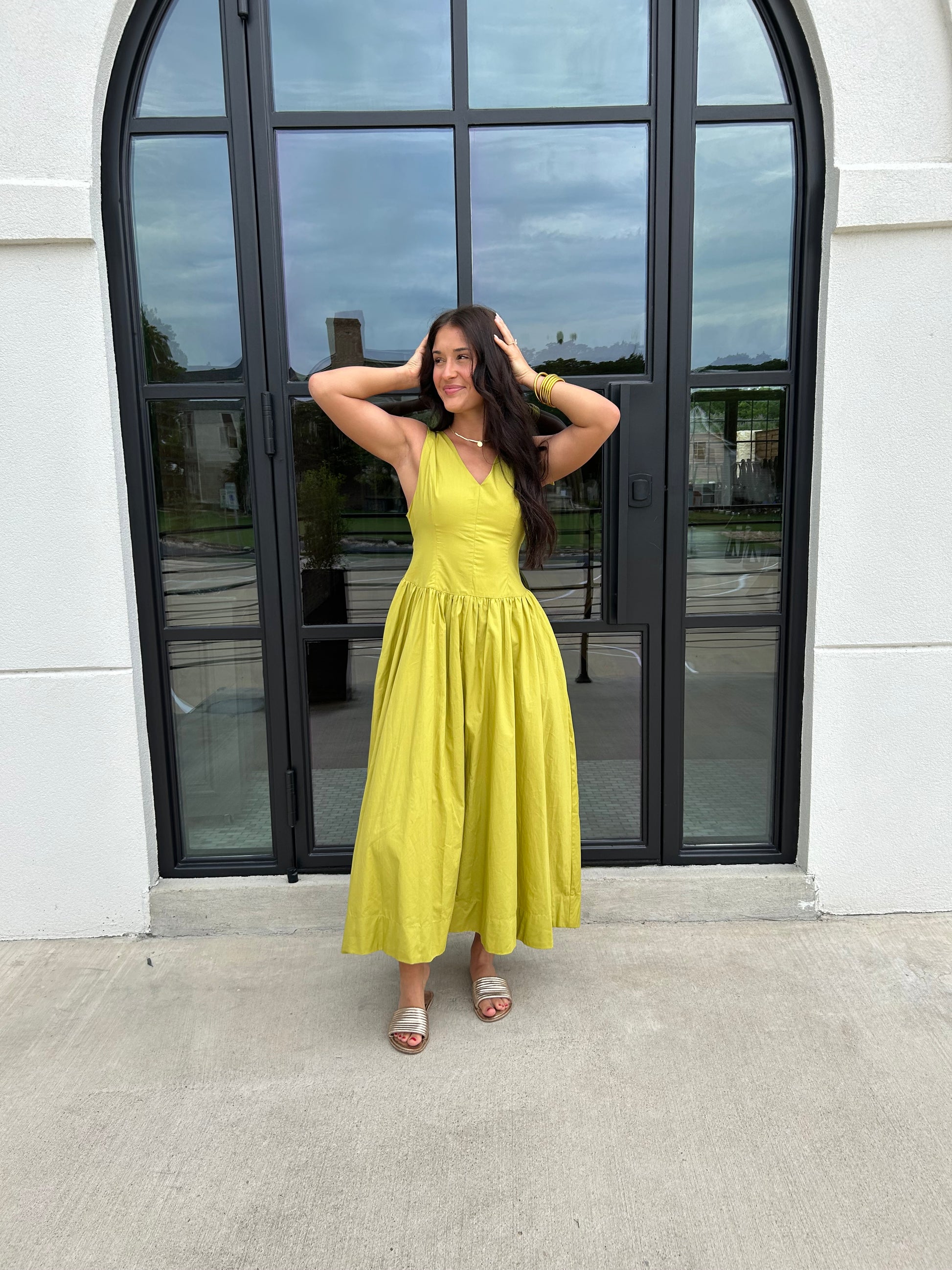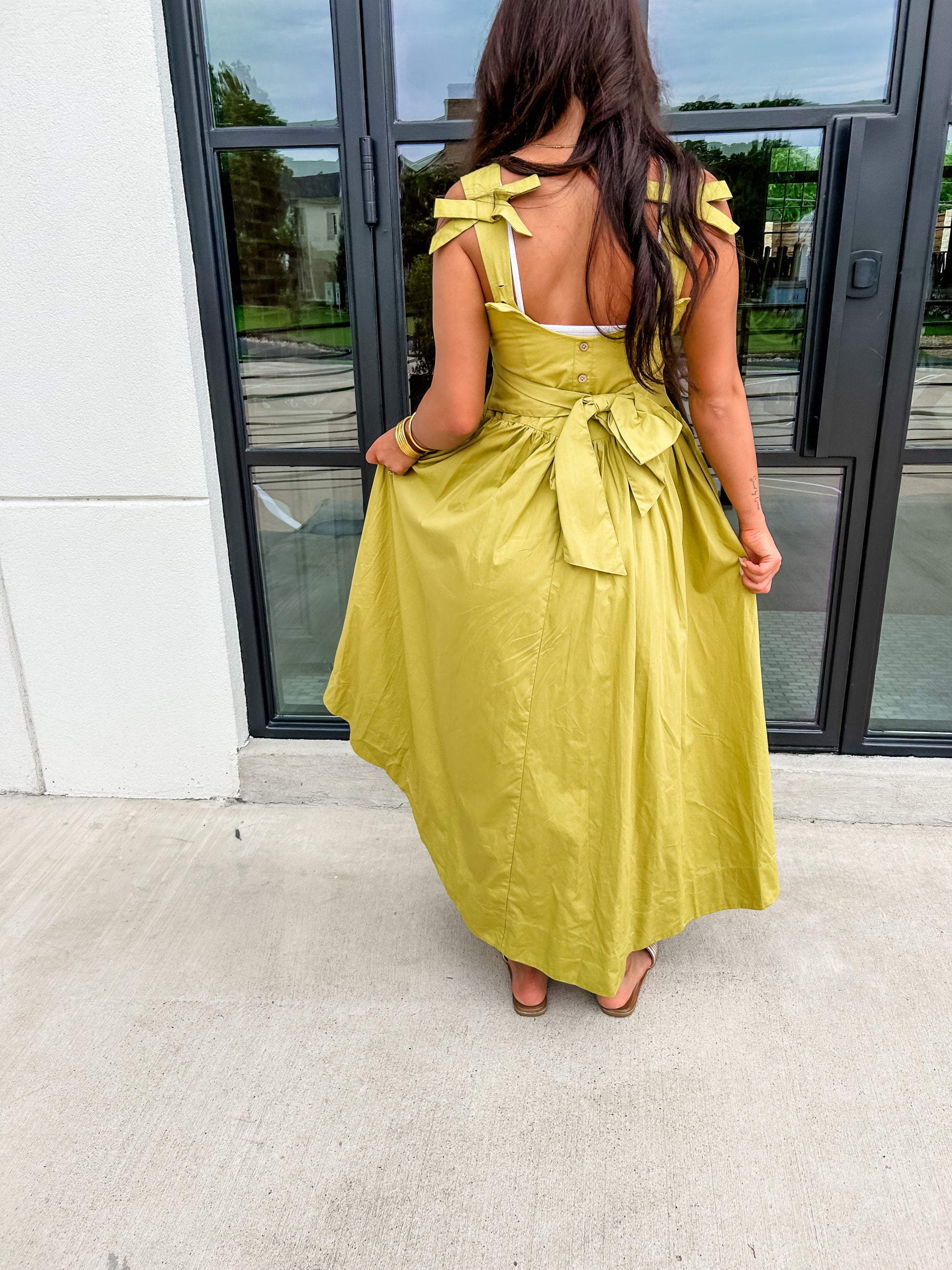 Effortlessly chic lemon grass midi dress, perfect for any summer occasion. Sleeveless design, adorned with delicate bow details on the straps. Stand out in this striking summer color!