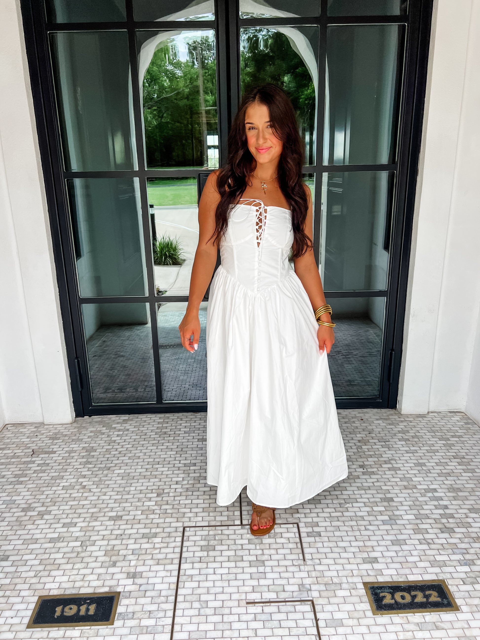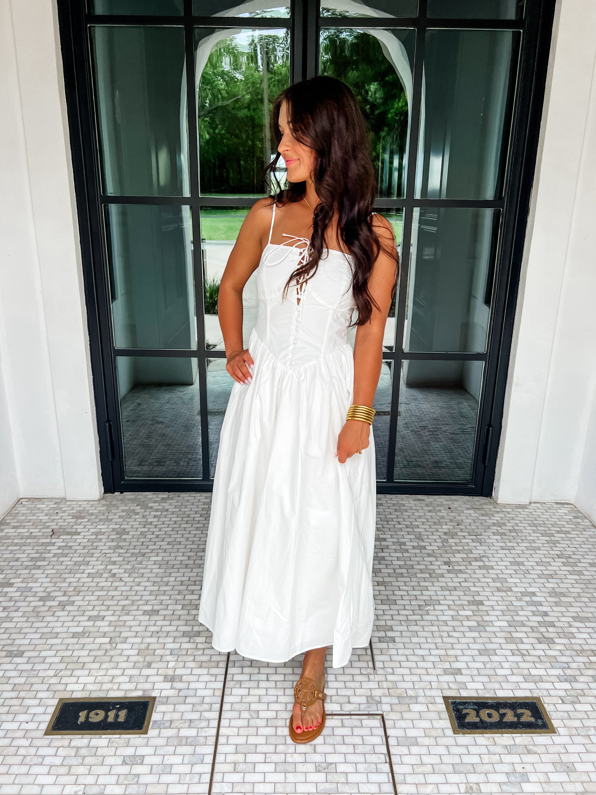 Experience effortless elegance with the Lillian White Dress. Crafted from 100% cotton poplin, this maxi dress offers breathable comfort and a flattering silhouette. The delicate lace-up detail adds a touch of charm and adjustable fit, making it perfect for warm days or special occasions. Embrace timeless style and all-day ease in this versatile wardrobe essential.