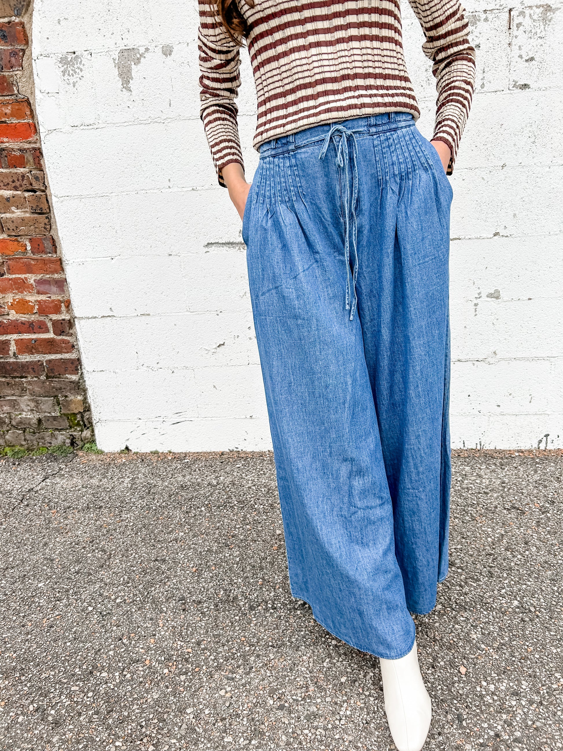 Slip into effortless style with these washed denim wide-leg pants that let you move freely and look amazing. The subtle pin tuck detailing adds a touch of personality without trying too hard—it's the kind of detail that makes people ask where you got them. Perfect for dressing up or down, these pants are your new go-to for any occasion that calls for comfort meets cool.