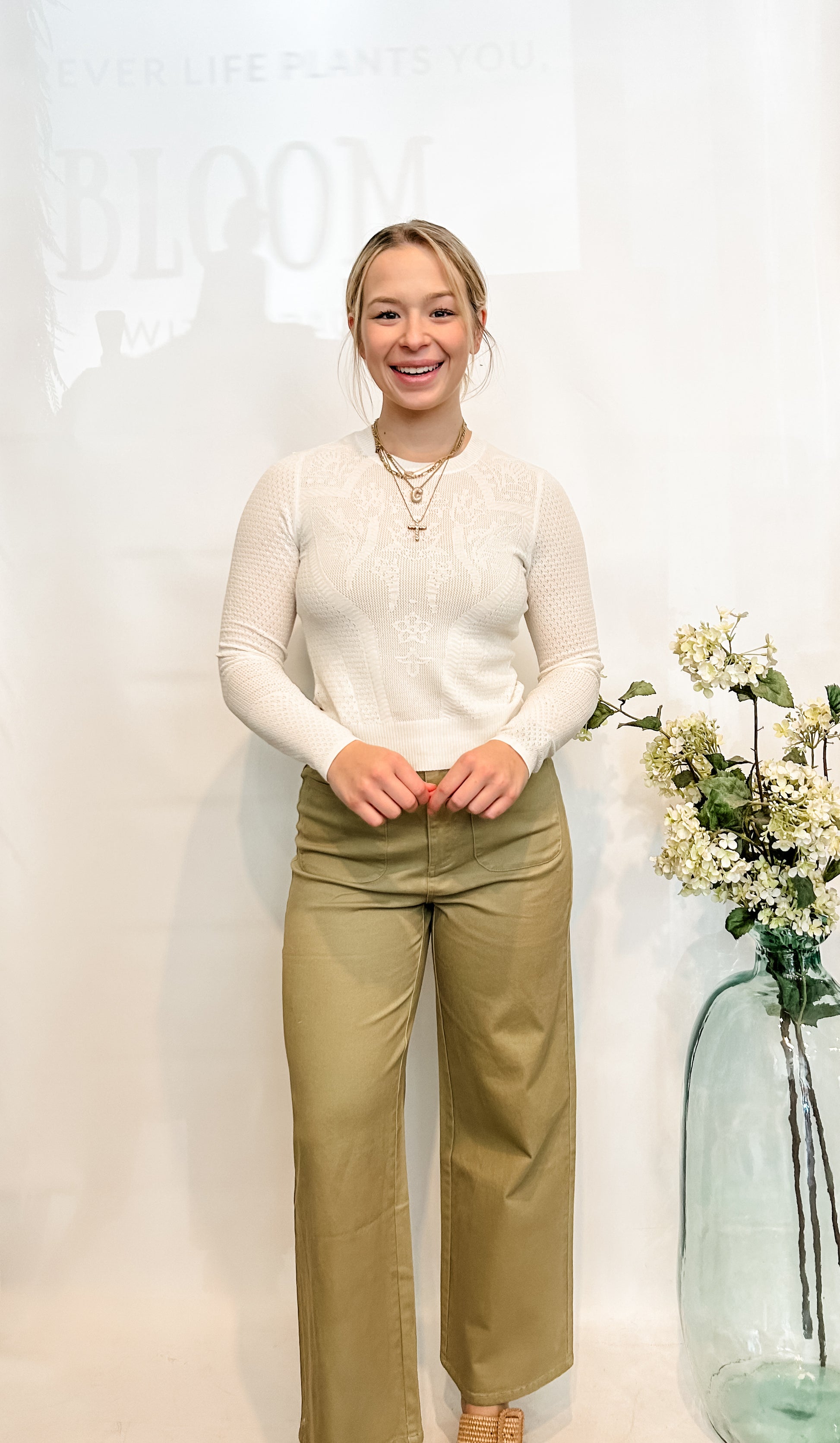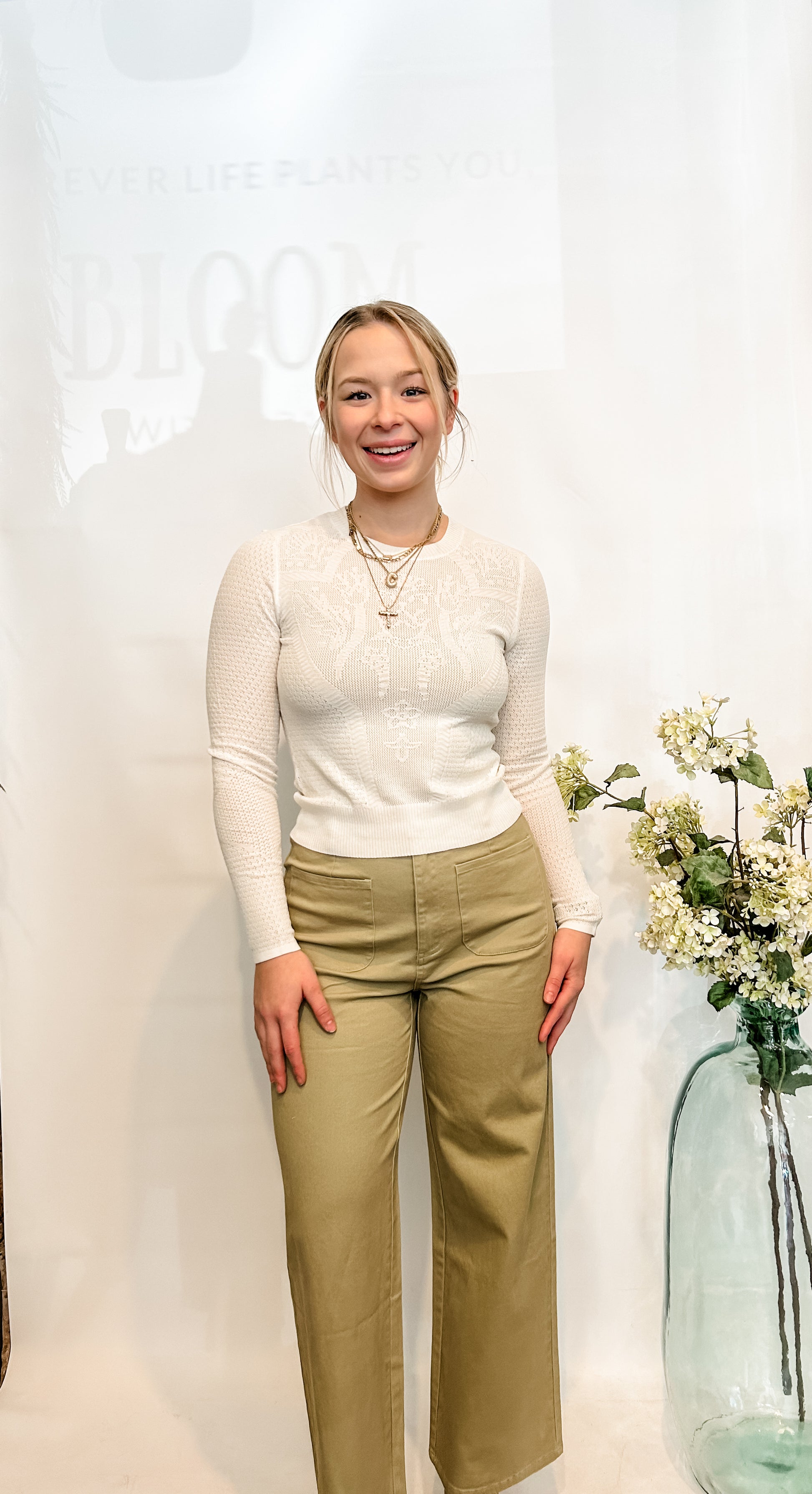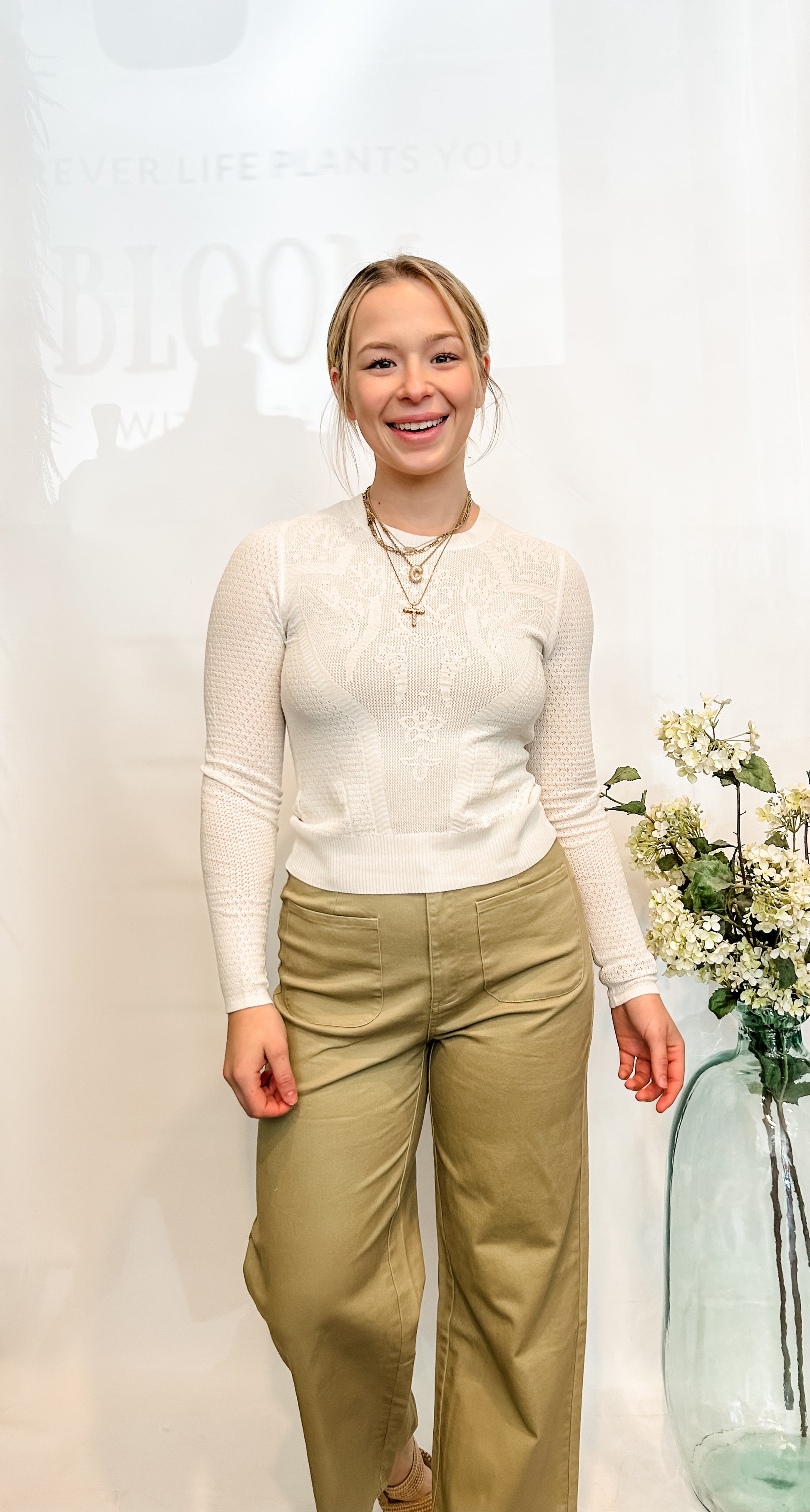 Experience ultimate comfort and style with our Melrose Top in Sea Salt. This Z Supply top features a fine crochet long sleeve design and buttery soft fabric for a cozy and chic look. The slightly sheer fabric allows for versatility - simply add a tank underneath and you're ready to go! Elevate your wardrobe with this must-have piece.