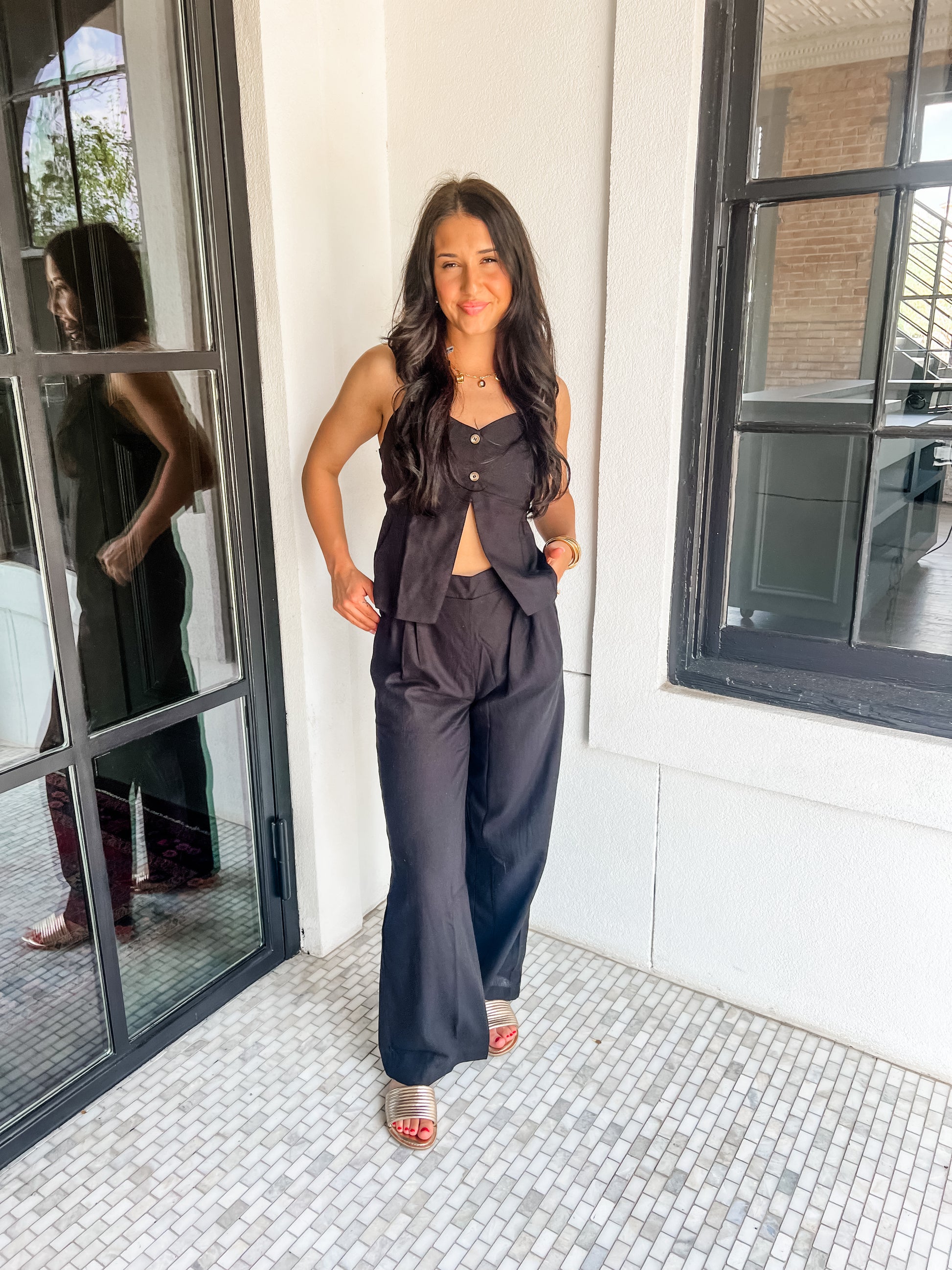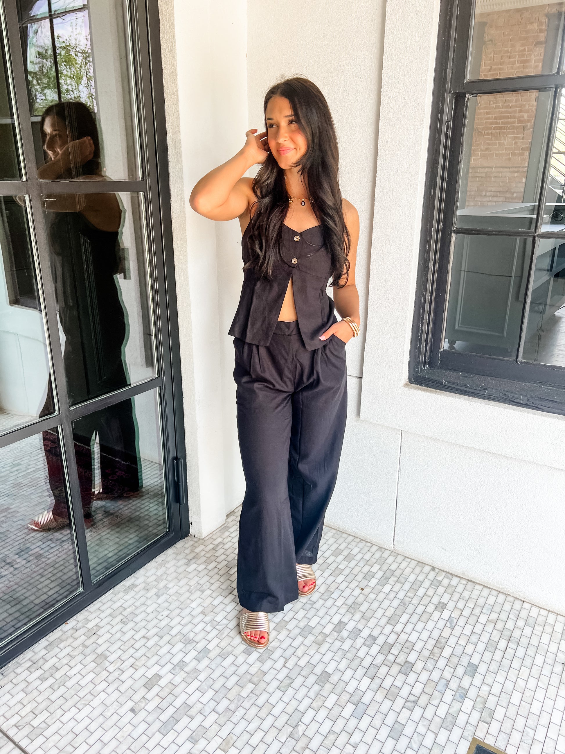 Elevate your style with our Midnight Black Pleat Pant. These high rise linen pants feature a front pleat for added sophistication. A must-have staple for any fashion-forward closet.