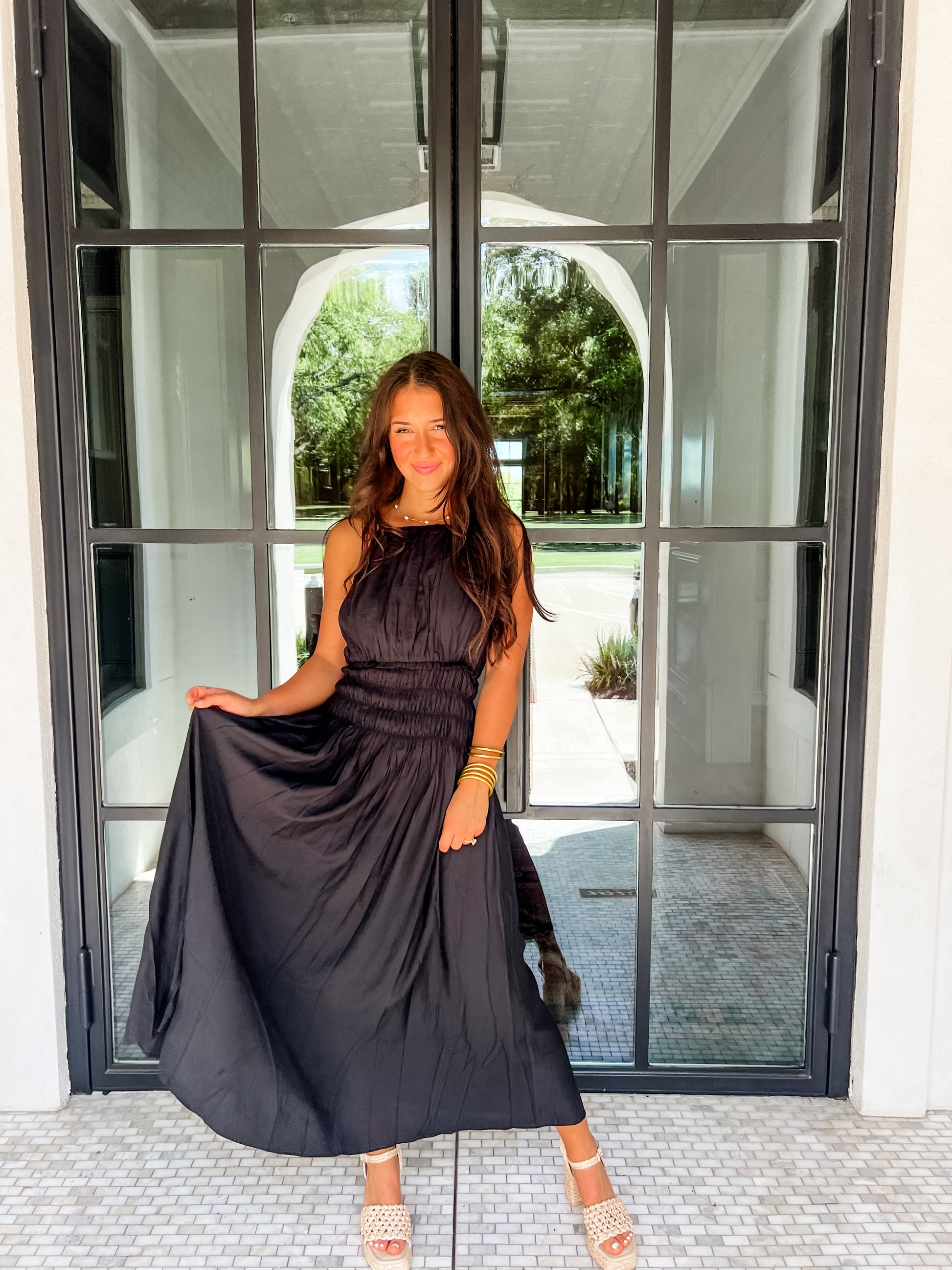 Step into the night with the Midnight Muse Maxi, a playful black crinkle maxi dress featuring a flirty halter-style top. Its flowing silhouette moves with you, perfect for dancing under the stars or turning heads at any summer soirée. Embrace effortless elegance with a touch of fun!