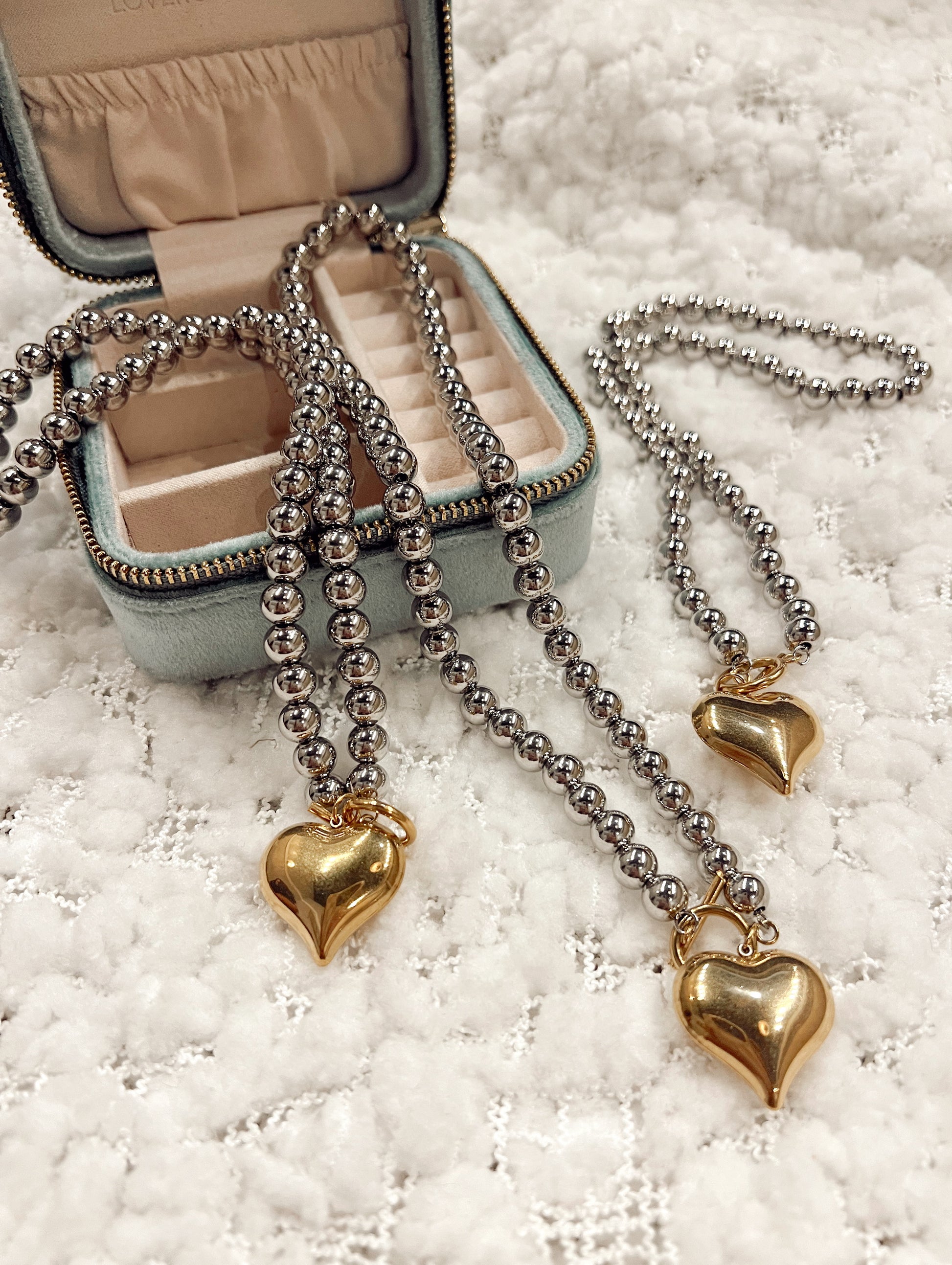 Add a fun twist to your look with this chunky silver beaded necklace featuring a puffy gold heart charm. Perfectly trendy and playful, it’s the ideal accessory to brighten any outfit with a mix of metals and a touch of charm.