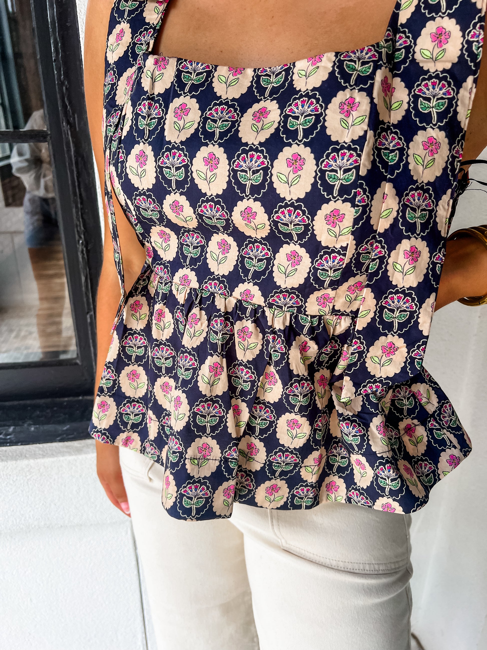 The Nellie Tank features a navy poplin fabric adorned with a delicate cameo floral print in soft pink hues. Designed with charming bows at the straps, this tank adds a feminine touch to your wardrobe. Its lightweight, breathable material ensures comfort while the elegant print makes it perfect for both casual outings and dressier occasions. Elevate your style effortlessly with this versatile and flattering piece.