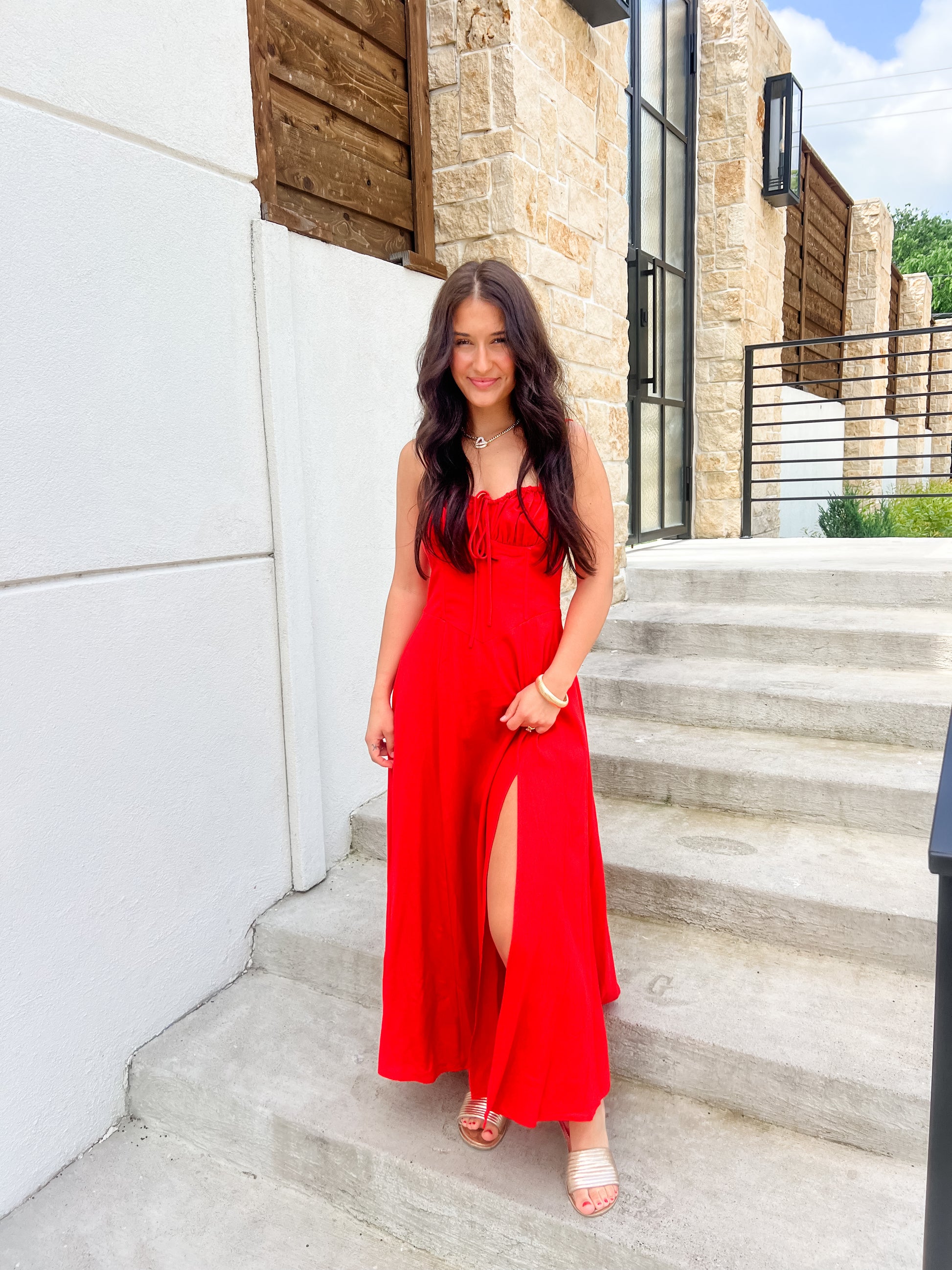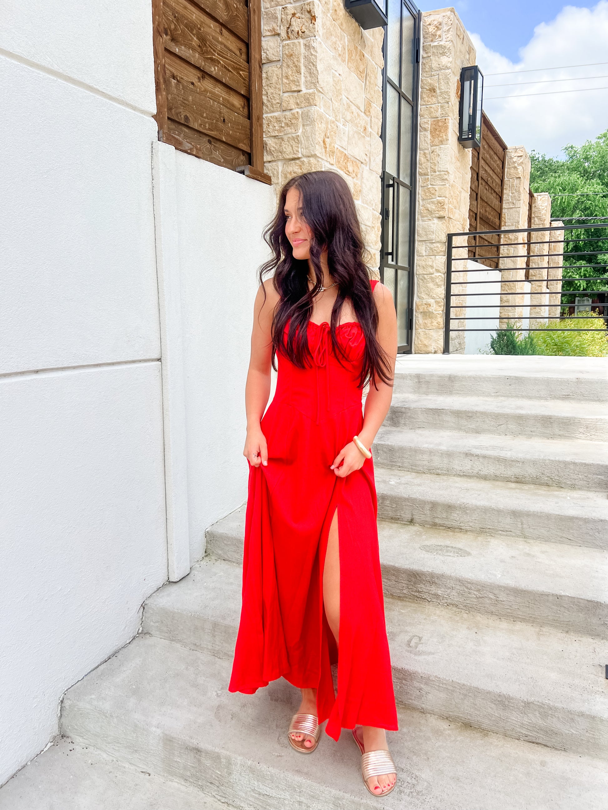 Get ready to turn heads in our stunning Red Rouge Midi Dress! With its eye-catching red color, corset detailing, and front side slit, this dress is sure to make you feel gorgeous and confident. Elevate your style and make a statement with this must-have dress!