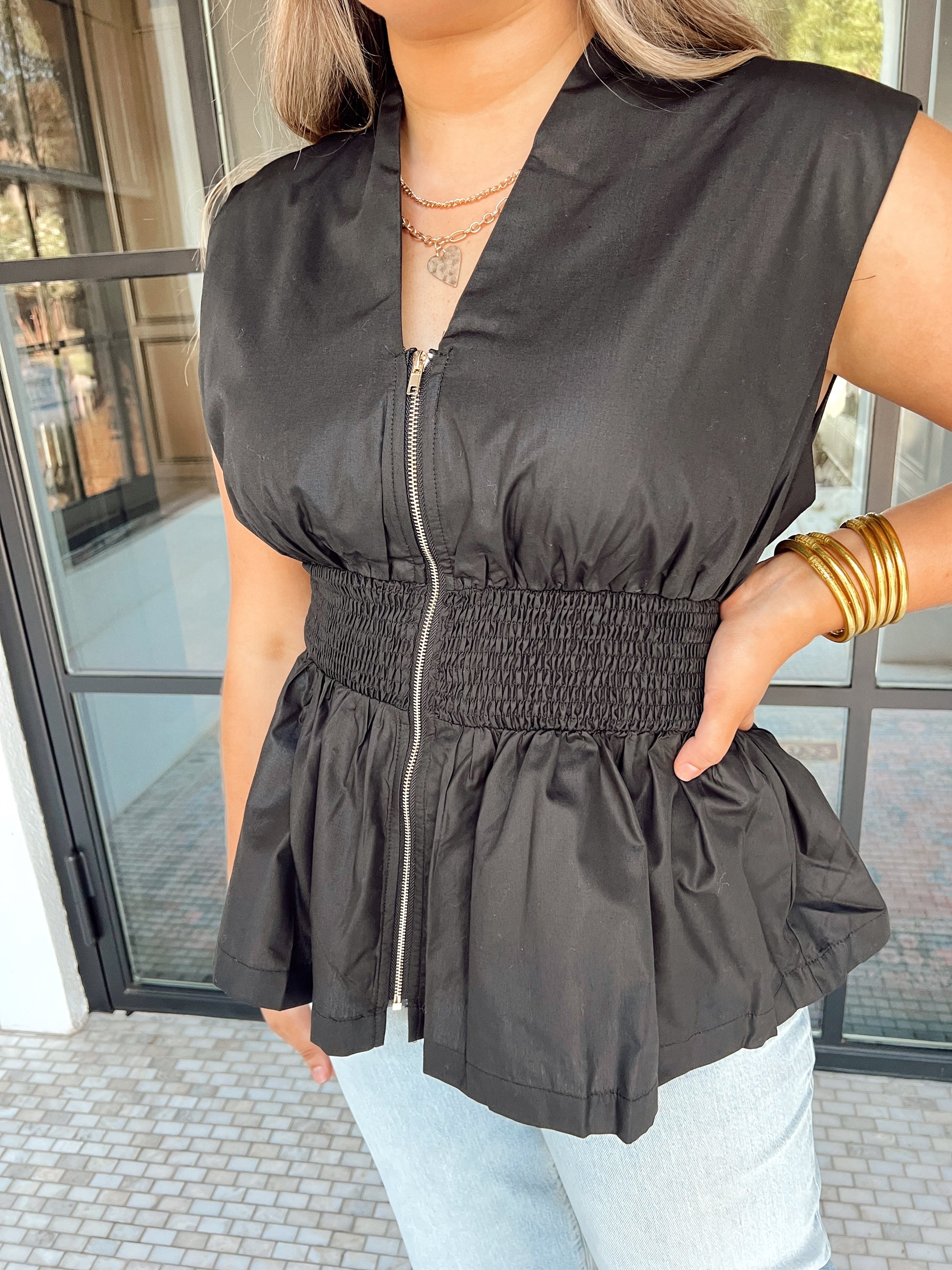 Elevate your style with the Remi Black Zipper Top! This sleeveless peplum piece features a sleek front zipper and a cinched waist that flatters your figure with a fun, flirty flair. Perfect for turning heads whether you're out on the town or dressing up for a night in.