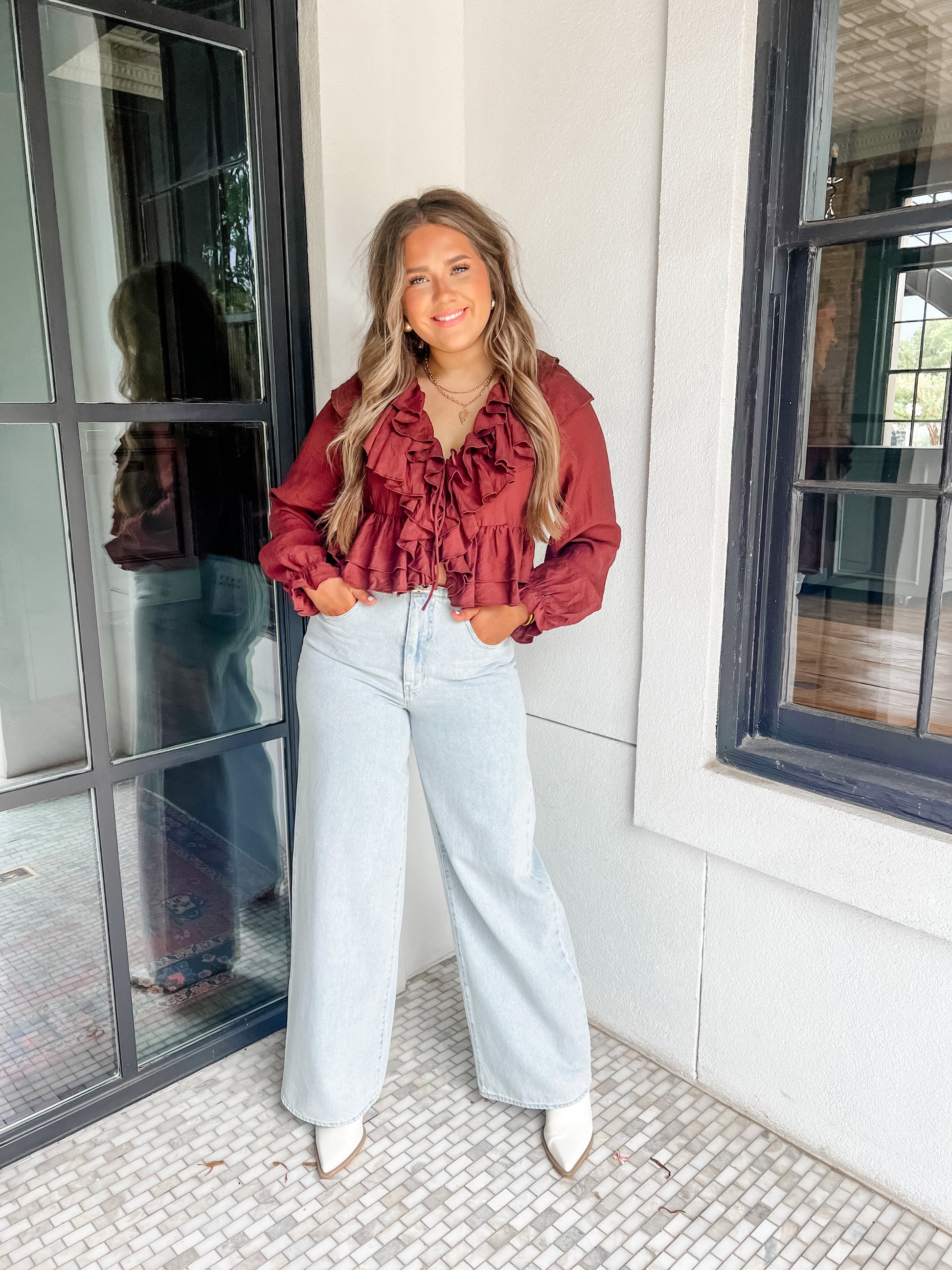 Embrace effortless charm with the Rust & Ruffle Top, featuring a playful v-neck and delicate ruffle details that add a flirty touch to its long sleeves. The beautiful brown hue brings warmth and versatility to your wardrobe, making this blouse-style top perfect for day-to-night adventures. Whether paired with jeans or a skirt, it promises a fun and feminine look wherever you go.