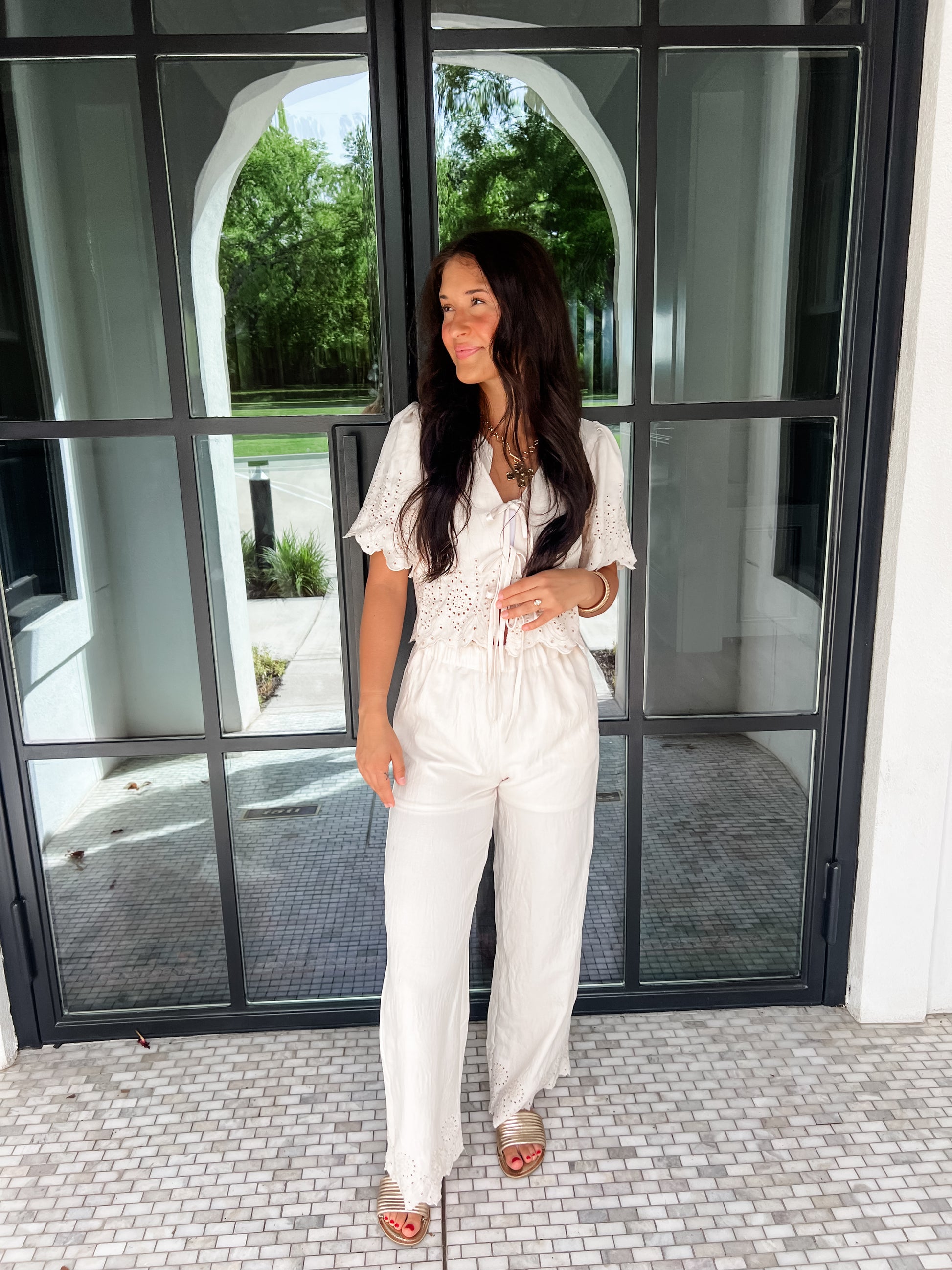 Experience the seaside in style with our Seaside Day Pant Set! This stunning set features a natural eyelet trim front tie blouse and matching pants, perfect for setting the mood. Get ready to make a statement and elevate your beach look with this must-have set.
