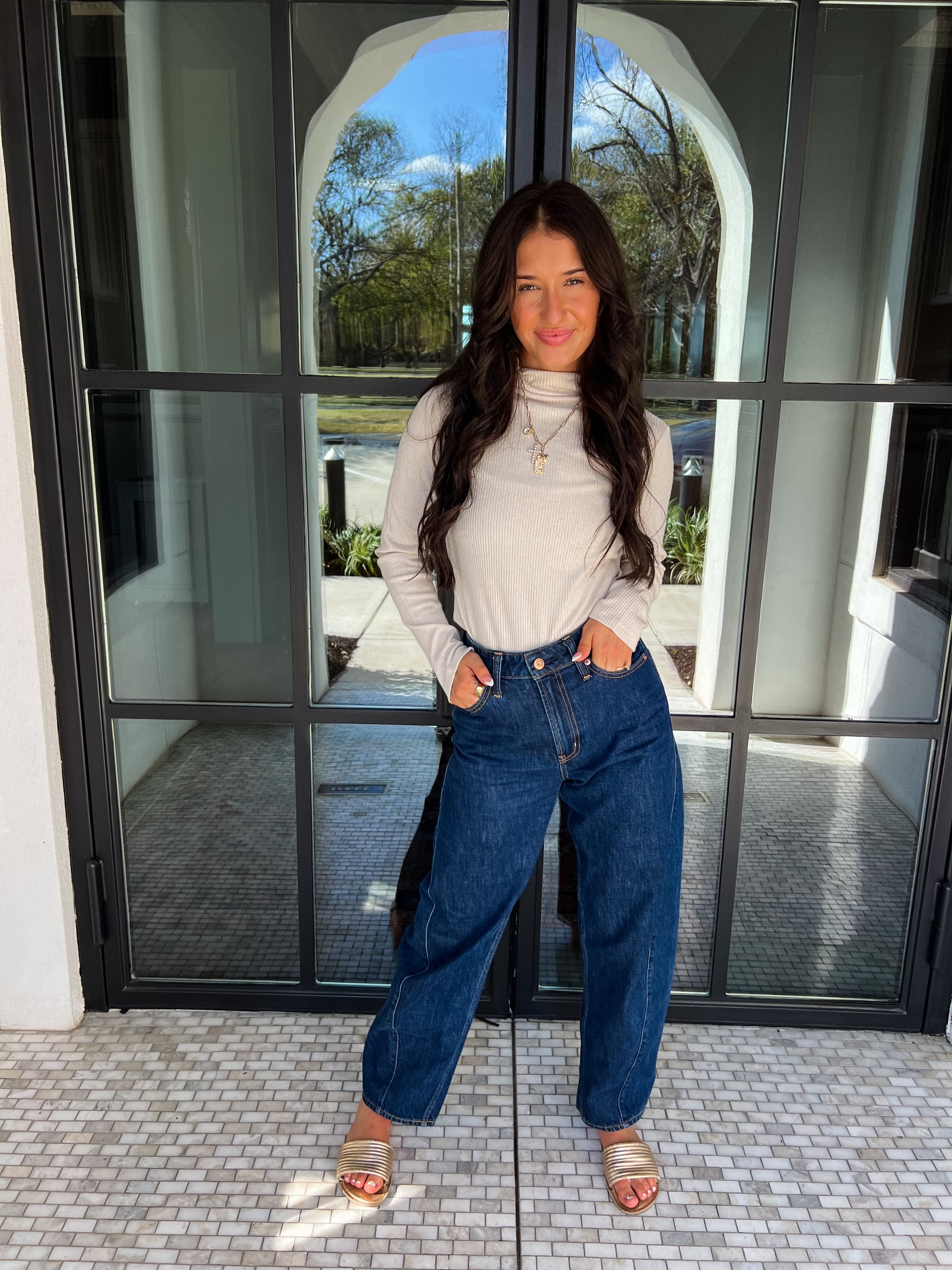 Add a touch of sparkle to your everyday look with the Shimmer and Shine Ribbed Top. This playful knit features a subtle shimmer throughout, a cozy mock neck, and long sleeves for effortless style. Available in classic black or ivory, it’s perfect for layering or wearing on its own to brighten up any outfit.