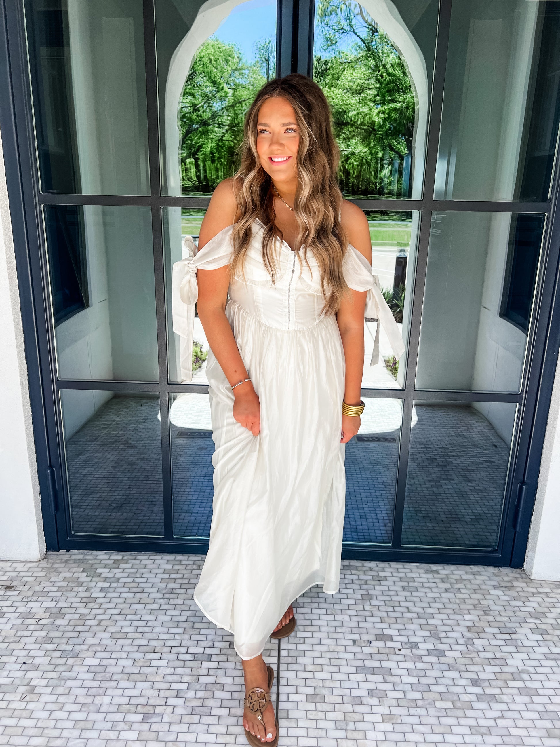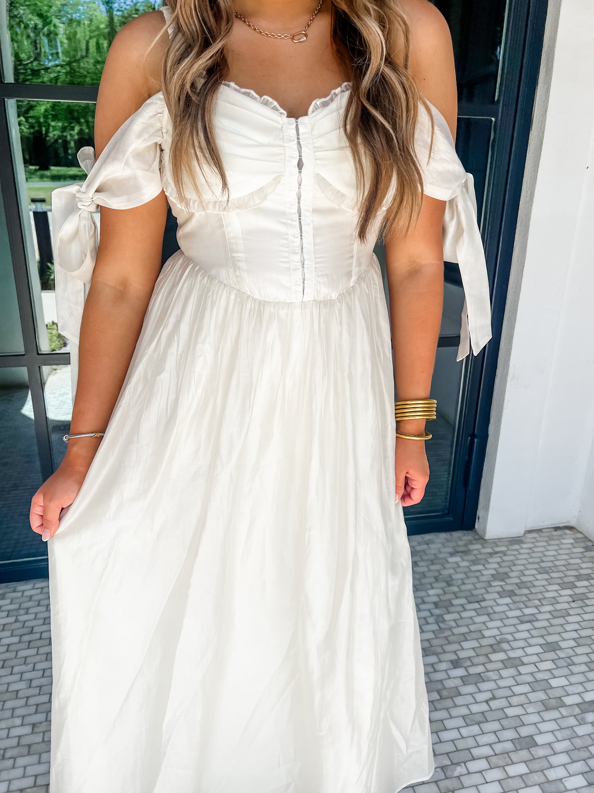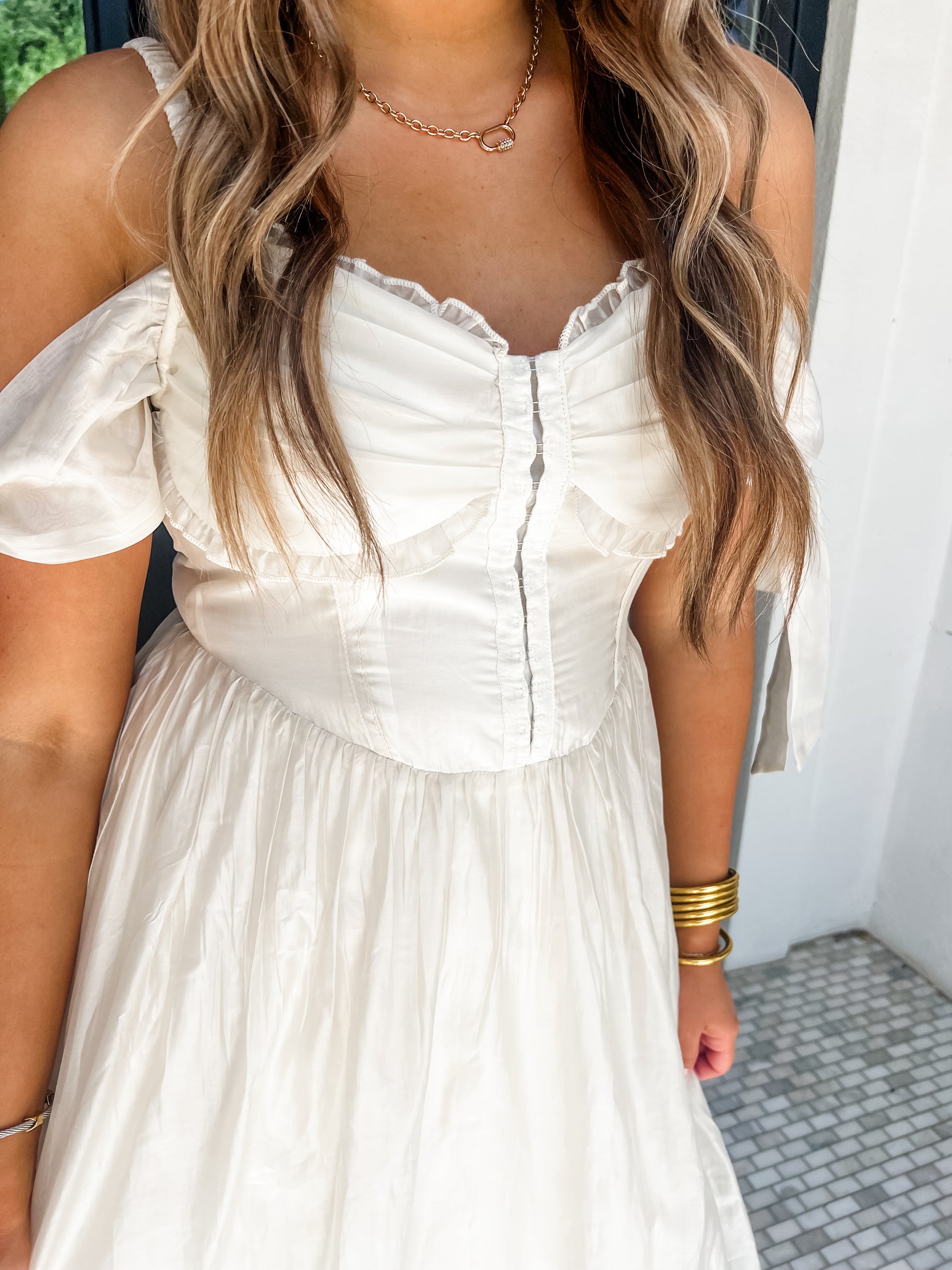 Elevate your style with our Sound of Romance Dress. This flowy off white dress boasts a corset style that accentuates your figure, while the ruffle top adds a touch of elegance. The off shoulder bows on the sleeves add a romantic and playful touch to this dress. Experience the feeling of luxury and romance in one dress.