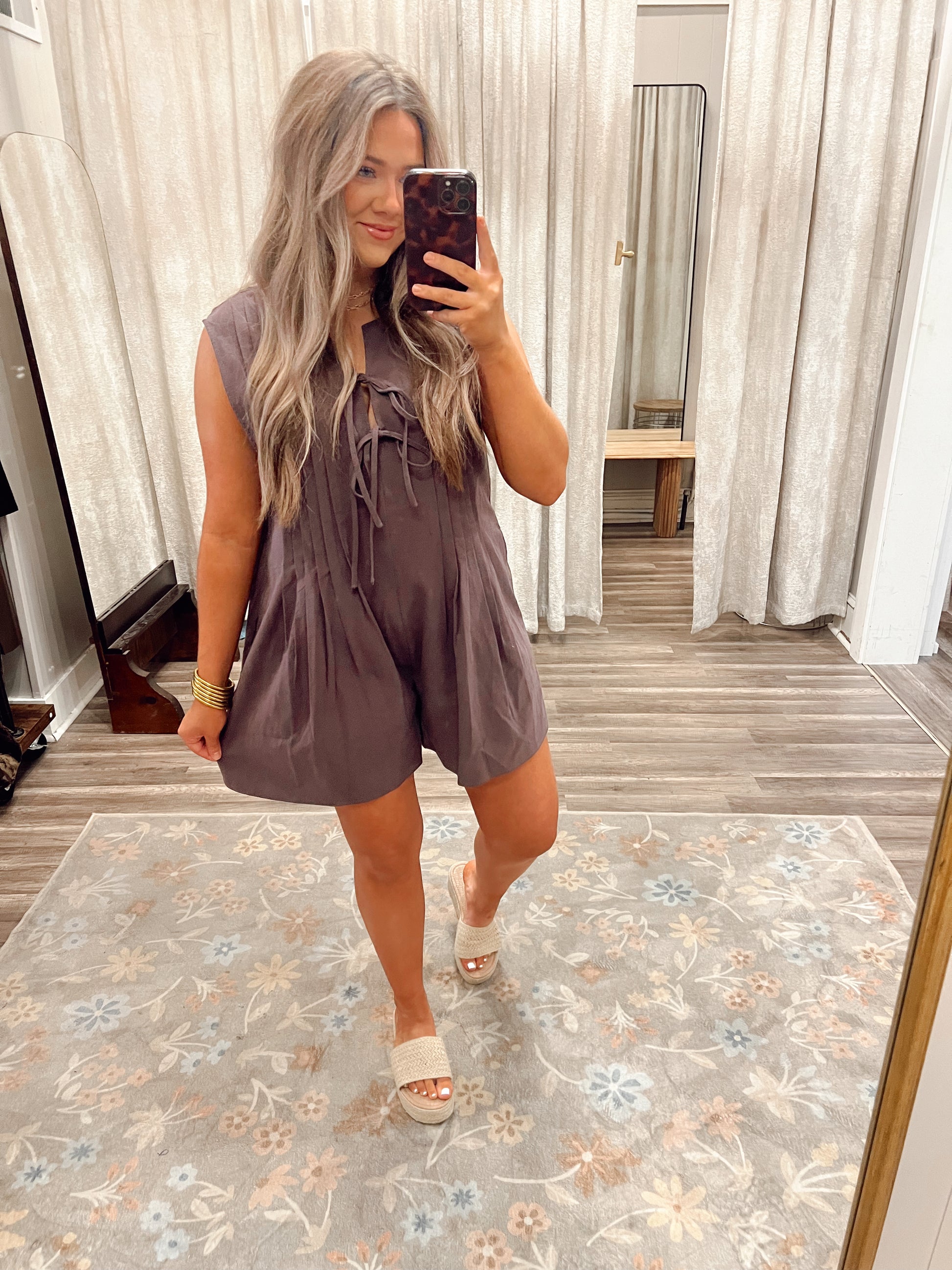 Effortlessly chic and versatile, this sleeveless romper features a flattering tied front and refined pleated detailing. The cool-toned brown hue offers a sophisticated neutral that pairs seamlessly with your favorite accessories. Perfect for warm weather adventures, casual outings, or elevated weekend looks, this piece transitions beautifully from day to night with minimal styling effort.