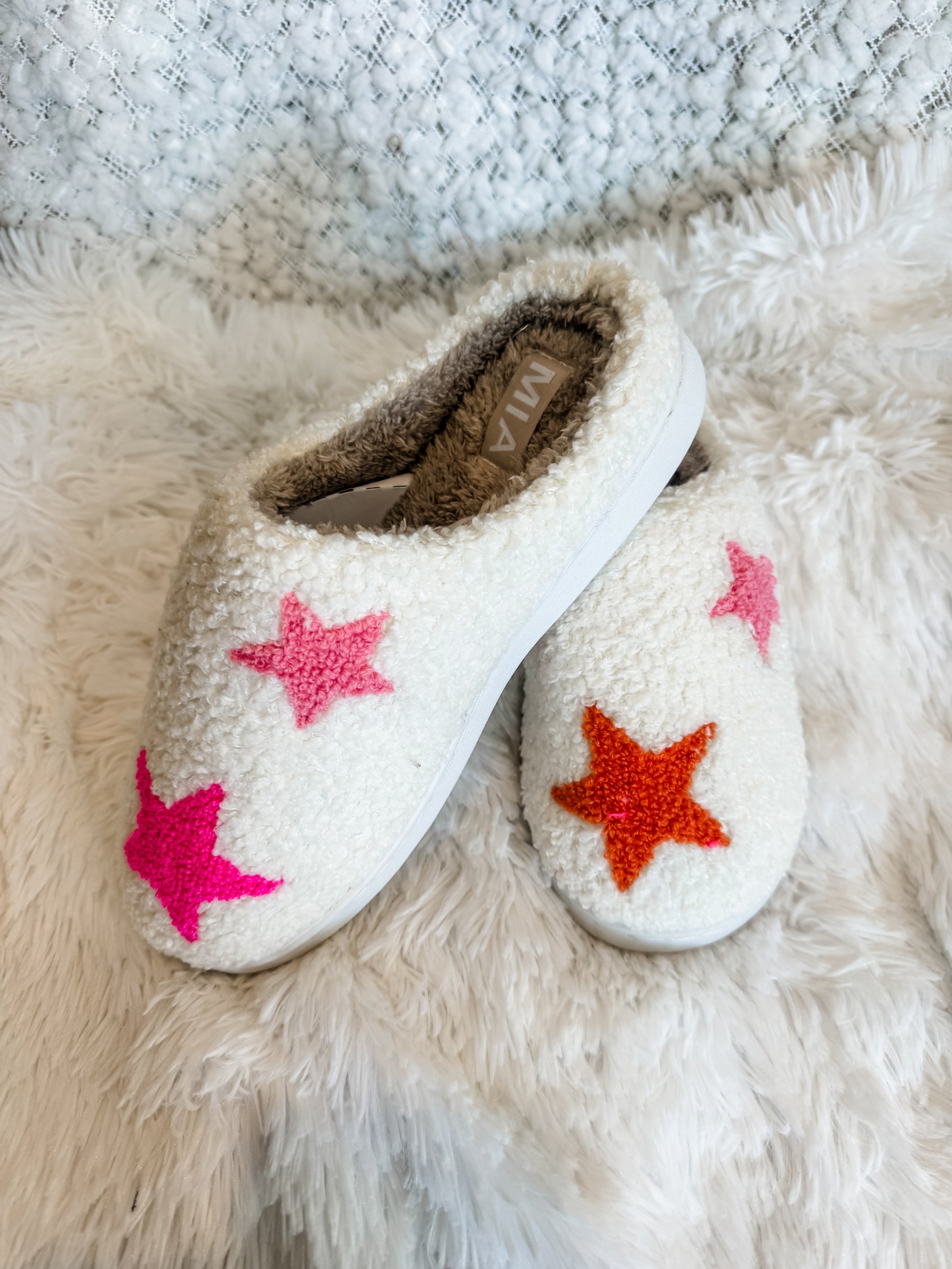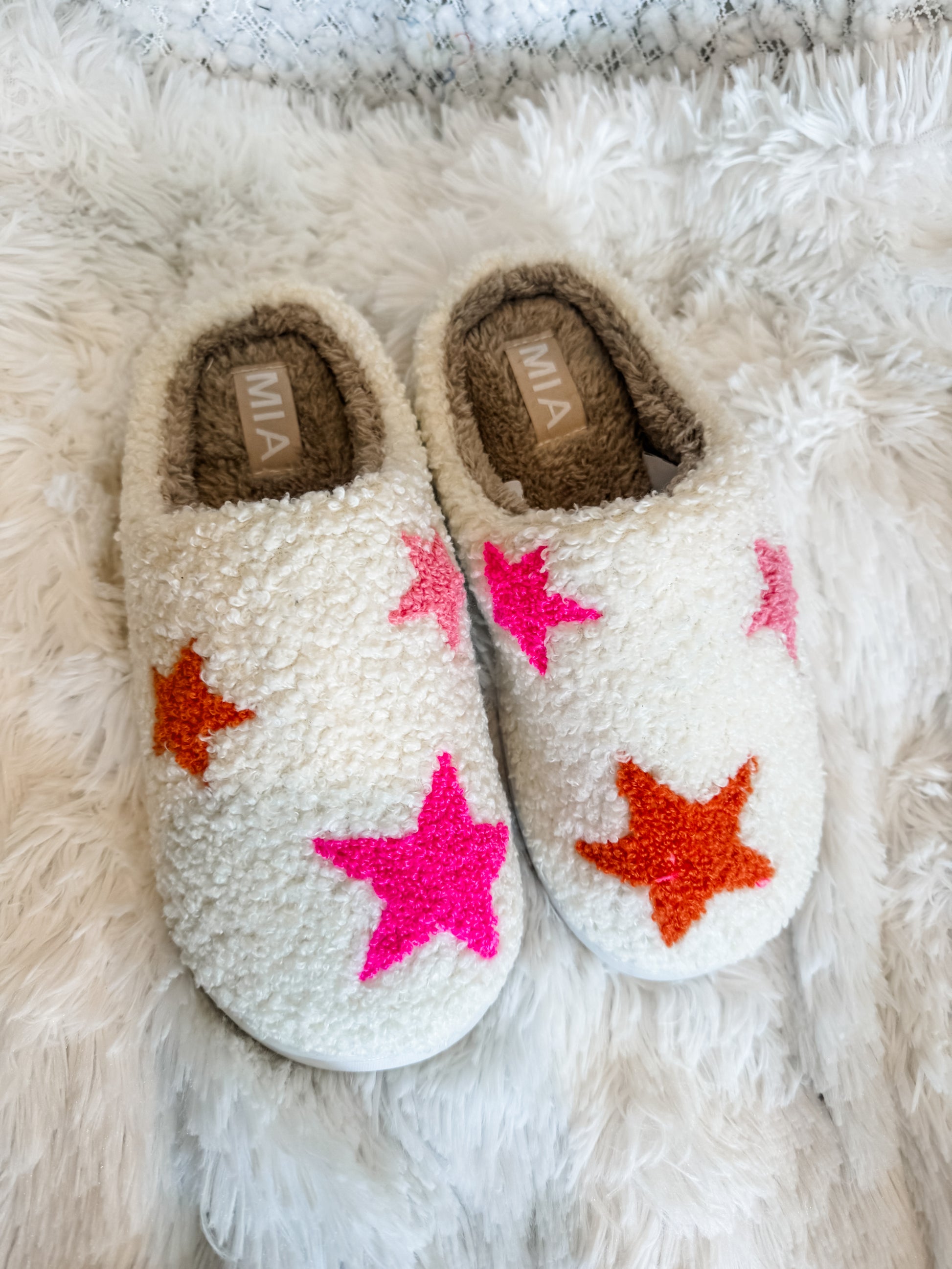 Introducing the Star Bright Slippers! These cozy ivory sherpa slippers are adorned with pink and orange stars, making them a unique and stylish addition to your wardrobe. Slip them on and enjoy comfortable warmth and a closed toe design. Perfect for lounging at home or adding a touch of whimsy to any outfit.