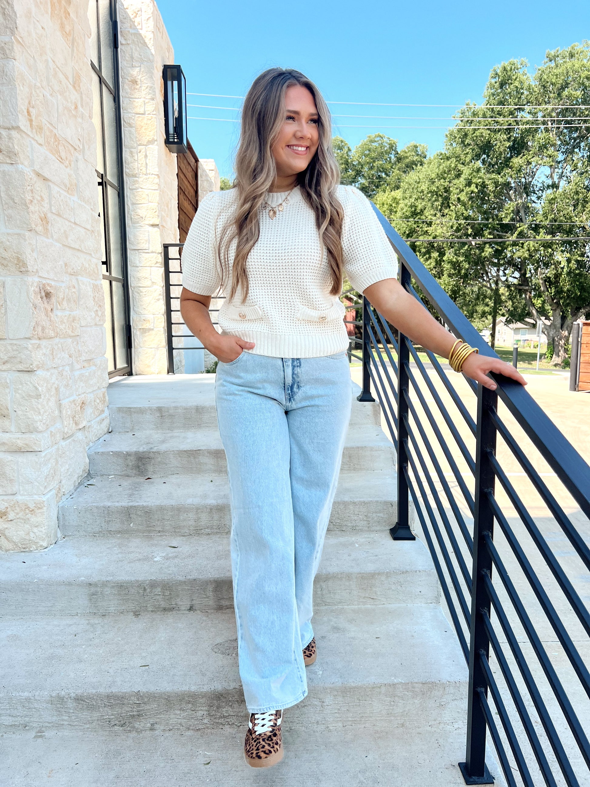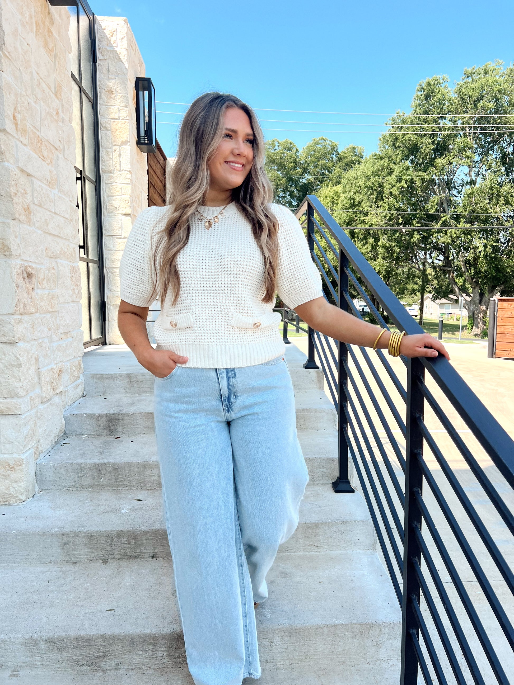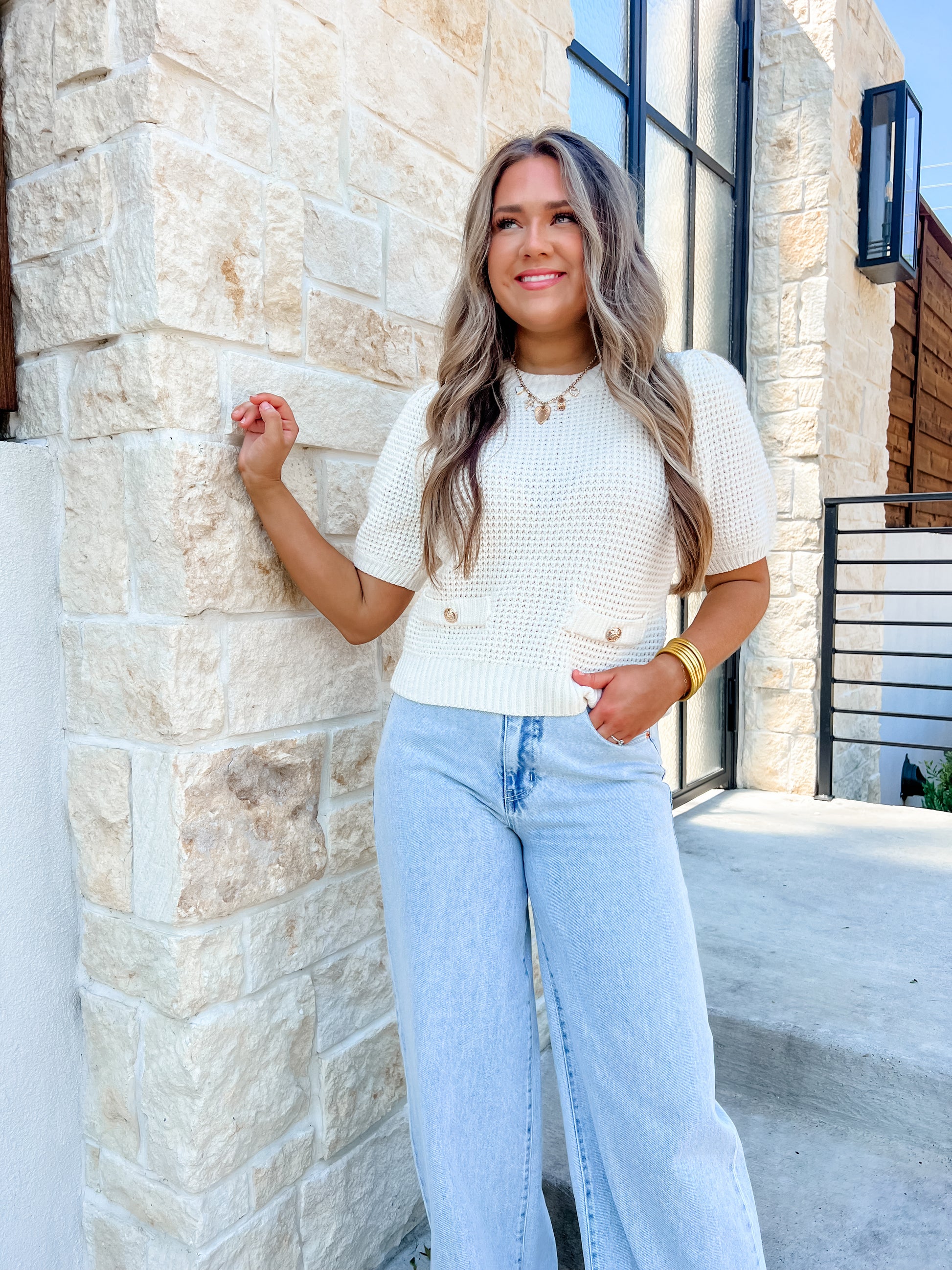 Experience the ultimate in summer comfort with our Summer Dreams Sweater Cream! This short sleeve crochet sweater features a front pocket detail with button for added style. Perfectly pairs with your favorite denim for a super cute and trendy look. Stay cool and fashionable all season long!