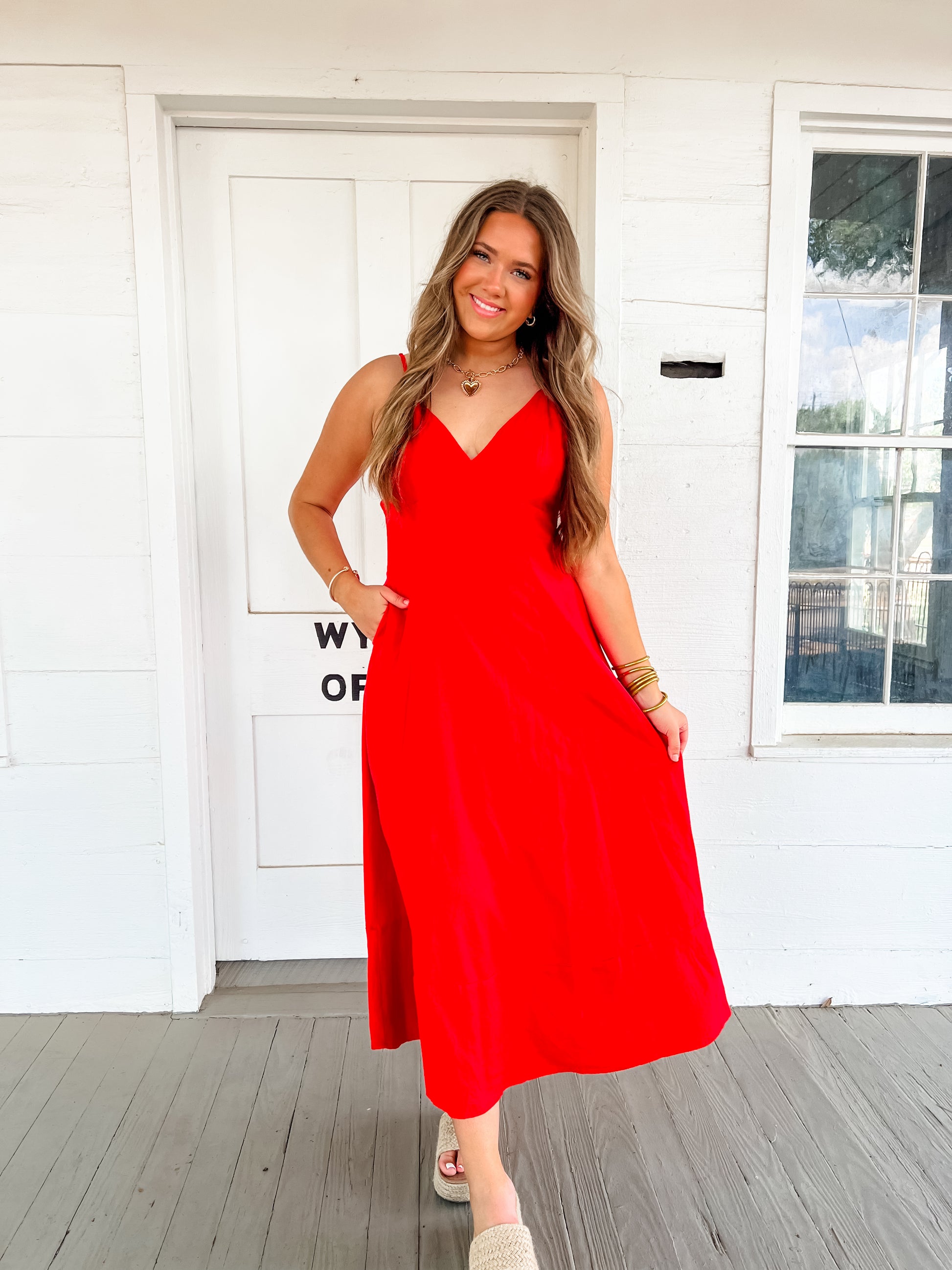 Get ready to turn heads in our Summer Heat Maxi Dress! This stunning tomato red linen dress features a flattering v neck and adjustable straps for the perfect fit. Look and feel effortlessly elegant and stay cool in the summer heat. Don't miss out on this must-have statement piece!