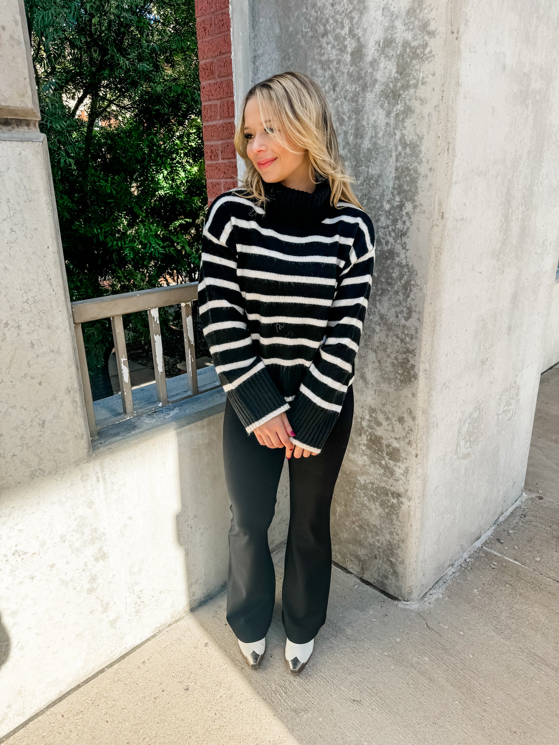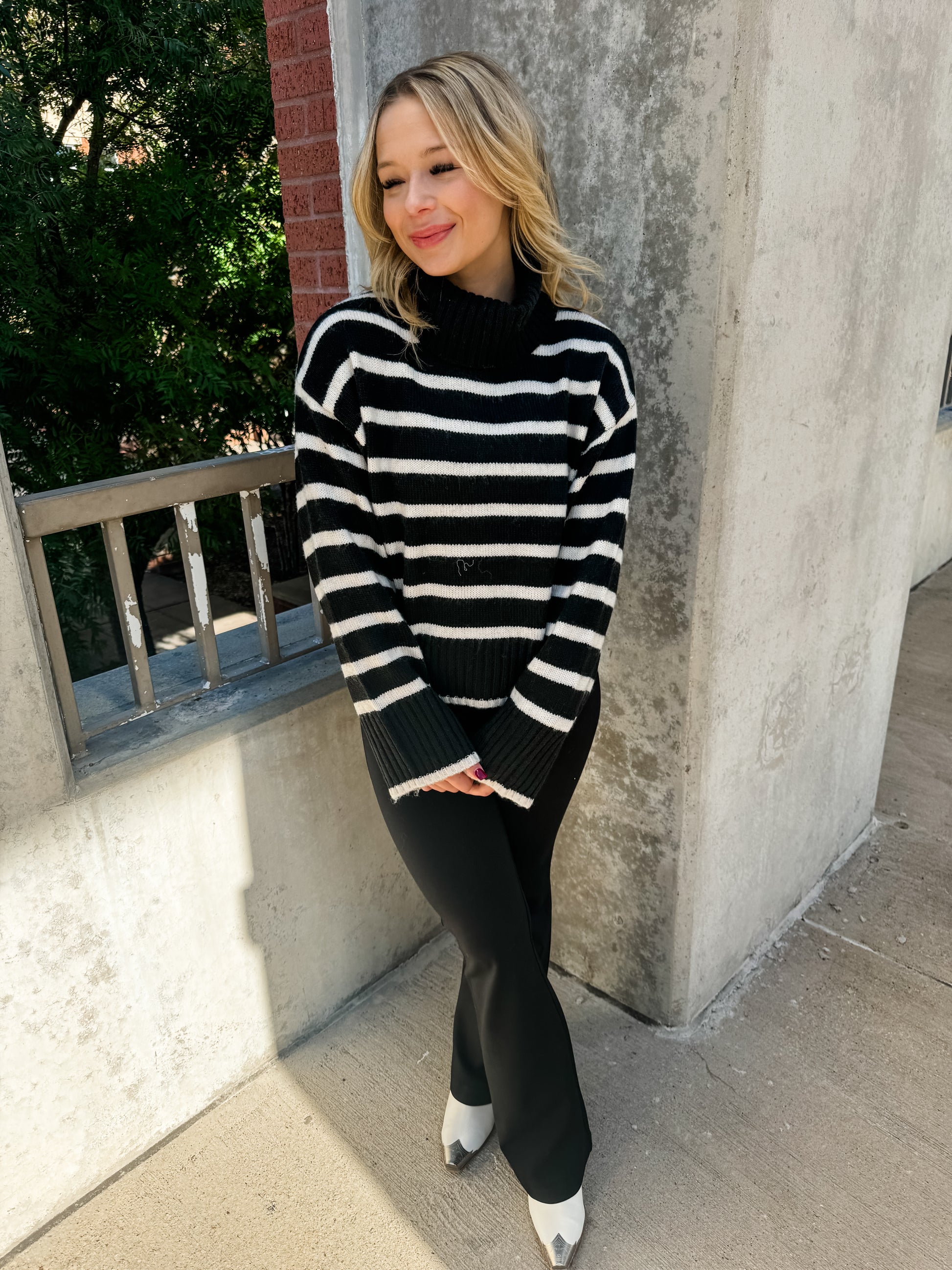 The Josephine Stripe Sweater is a must-have for any wardrobe. With its cowl neck and bell sleeves, this sweater offers both style and comfort. The classic black and white stripes add a touch of sophistication to any outfit. Stay warm and fashionable with this versatile piece.