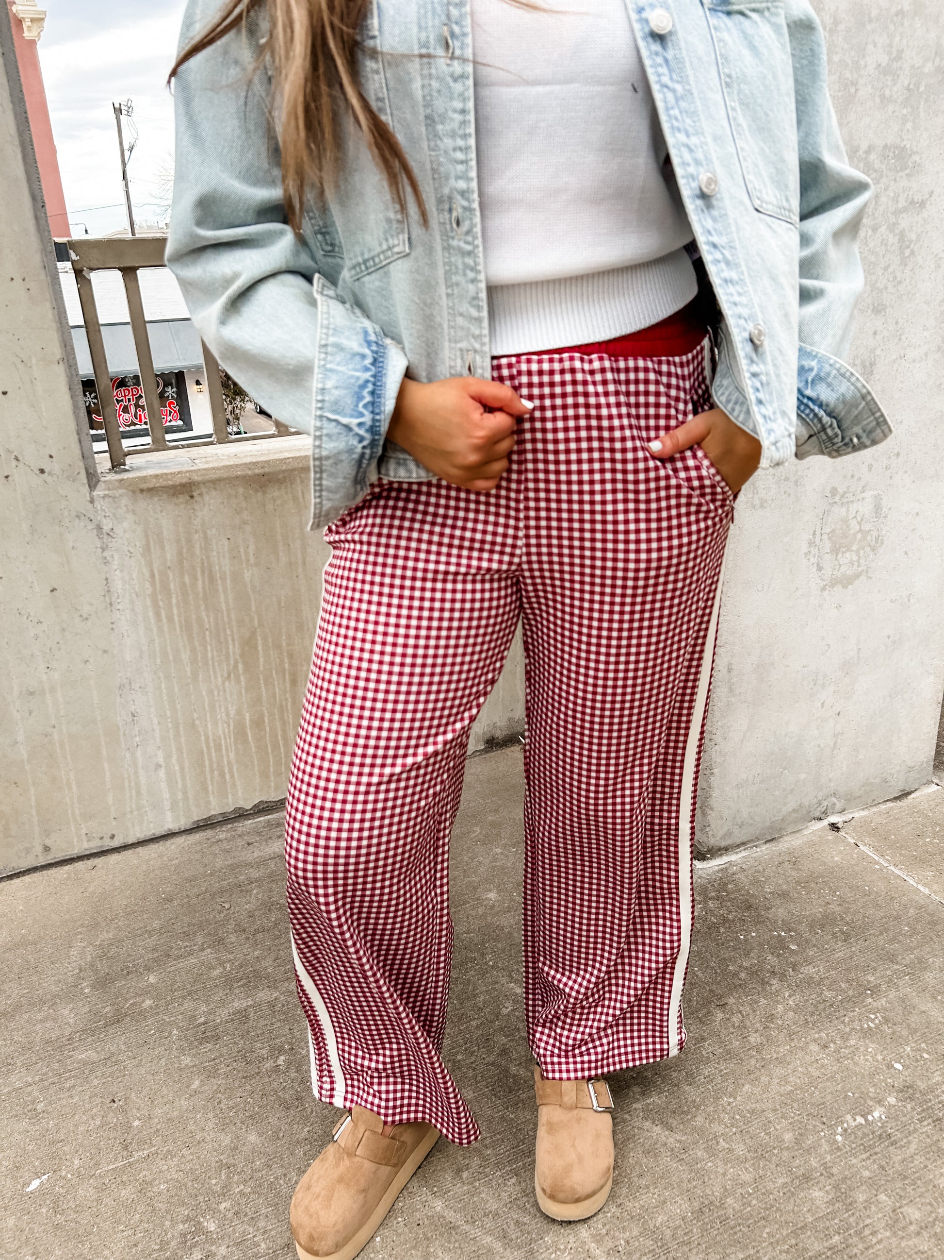 Elevate your casual wardrobe with these Weekend Gingham Pants, featuring a timeless burgundy and white gingham pattern that effortlessly blends playful charm with refined style. The mid-rise cut offers a flattering silhouette, while the distinctive side stripe detail adds a contemporary edge. Perfect for weekend getaways or relaxed social occasions, these pants strike the ideal balance between fun and polished sophistication.