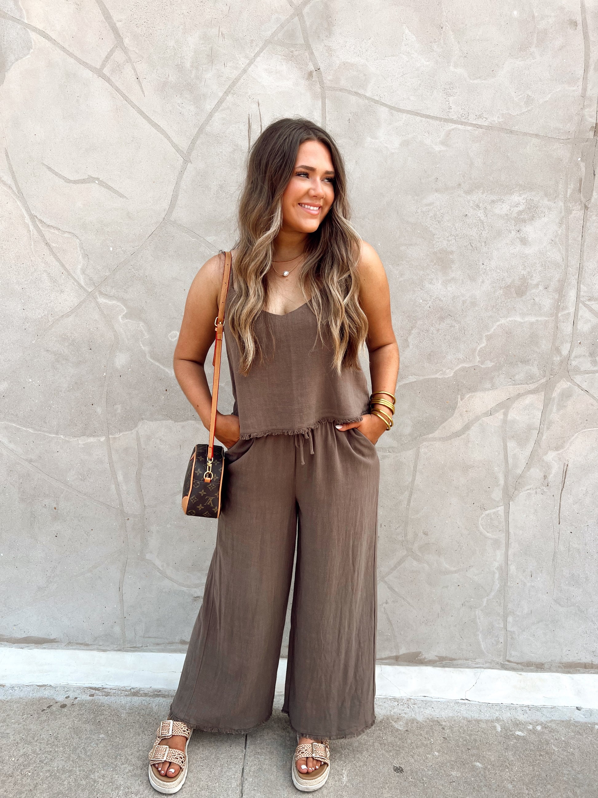 These Z Supply Soren Pants in chocolate tiki brown bring effortless style and comfort together. Featuring a drawstring waist for a perfect fit and frayed hems for a laid-back vibe, they’re super cute and cozy—ideal for lounging or casual outings with a playful twist.